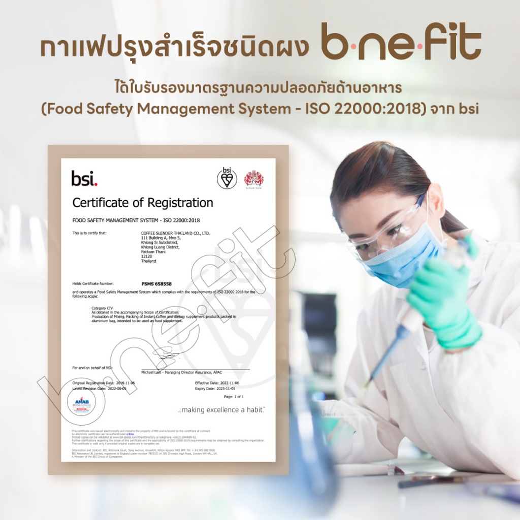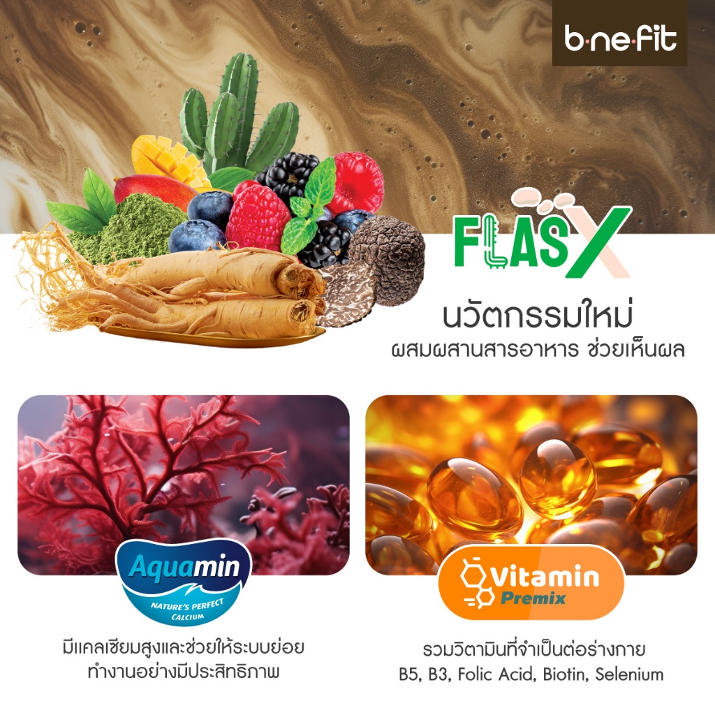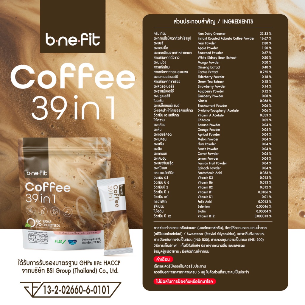 ... เอกลักษณ์อย่างลงตัว ด้วยปริมาณคาเฟอีนที่สูงถึง 2% กาแฟโรบัสต้าช่วยให้คุณรู้สึกสดชื่นและพร้อมลุยในทุกวัน ✅  เป๊ะได้ อร่อยด้วย !😋  เพราะ B.ne.fit Coffee  ใช้หญ้าหวานเป็นสารให้ความหวานแทนน้ำตาล น้ำตาล 0% เคอเลสเตอรอล 0 % นอกจากนี้ เรายังได้นำเสนอส่วนผสมพิเศษที่คัดสรรมาอย่างดีเพื่อเสริมคุณค่าให้กับกาแฟถ้วยโปรดของคุณ ไม่ว่าจะเป็น สารสกัดจากส้ม ที่อุดมไปด้วยวิตามิน และแร่ธาตุหลากหลายชนิด ผักผลไม้ 5 สี ที่ประกอบด้วย กล้วย, ส้ม, แพร์, แอปเปิล, แอพริคอต, เมลอน, พลัม, พีช, แครอท, มะนาวเทศ, เสาวรส, สตรอว์เบอร์รี และป๋วยเล้ง มีวิตามินซีสูง บำรุงผิวพรรณ ผิวสวยใส  มีทั้งใยอาหาร  ช่วยในการย่อยและการขับถ่าย ไฟเบอร์สูง อยู่ท้องได้นาน รวมทั้ง Mix Berry Powder และวิตามิน B1, B2, B6, B12, A, D, E, K ที่เหมาะสำหรับคนที่อ่อนเพลีย ทำงานหนัก และนอนดึกเป็นประจำ   ✅  B.ne.fit Coffee พิเศษสารสกัดจาก ธรรมชาติ  WHITE KIDNEY BEAN ถั่วขาวอุดมไปด้วยสารอาหารและไฟเบอร์ ที่ช่วยในเรื่องของการย่อยอาหาร GINSENG EXTRACT  ช่วยให้ กระปรี้กระเปร่า และมีส่วนช่วยเพิ่มประสิทธิภาพในการย่อยอาหาร GREEN TEA EXTRACT ช่วยให้รู้สึกสดชื่น เผาผลาญ CHITOSAN ดูแลระบบขับถ่ายโดยทำให้แบคทีเรียภายในลำไส้ทำงานได้ดีขึ้น   ✅  B.ne.fit Coffee   มาพร้อมกับนวัตกรรมใหม่ FLASX  ผสมผสานสารสกัดระหว่าง  อความิน Aquamin ผลิตจากสาหร่ายทะเลสีแดงแคลเซียมสูงและช่วยให้ระบบย่อยอาหารทำงานอย่างมีประสิทธิภาพ  Vitamin Premix รวมวิตามินที่จำเป็นต่อร่างกาย B5, B3, Folic Acid, Biotin และ Selenium   ช่วยดูแลและห่วงใย เริ่มต้นวันใหม่ด้วยแก้วแรกอย่างลงตัว  ✅ จำนวน : แพ็ค 5 ถุง (100 ซอง) ✅ เลข อย.ที่จดแจ้ง 13-2-02660-6-0101 ✅ น้ำหนักรวมสุทธิ 1,500 กรัม (15 กรัม x 100 ซอง) ✅ ส่วนประกอบสำคัญ / INGREDIENTS 👉 ครีมเทียม Non Dairy Creamer 33.33% 👉 ผงกาแฟโรบัสดาคั่วสำเร็จรูป Instant Roasted Robusta Coffee Powder 16.67% 👉 ผงแพร์ Pear Powder 2.80% 👉 ผงแอปเปิ้ล Apple Powder 1.20% 👉 ผงแคลเซียมจากสาหร่ายทะเล Seaweed Powder 0.67% 👉 สารสกัดจากถั่วขาว White Kidney Bean Extract 0.50% 👉 ผงมะม่วง Mango Powder 0.50% 👉 สารสกัดโสม Ginseng Extract 0.40% 👉 สารสกัดจากกระบองเพชร Cactus Extract 0.275% 👉 ผงเอลเดอร์เบอร์รี Elderberry Powder 0.18% 👉 สารสกัดจากชาเขียว Green Tea Extract 0.15% 👉 ผงสตรอเบอร์รี Strawberry Powder 0.14% 👉 ผงราสพ์เบอร์รี Raspberry Powder 0.12% 👉 ผงบลูเบอร์รี Blueberry Powder 0.08% 👉 ไนอะซิน Niacin 0.066% 👉 ผงแบล็คเคอร์แรนต์ Blackcurrant Powder 0.06% 👉 ดี-แอลฟา-โทโคเฟอริลแอซีเทต D-Alpha-Tocopheryl Acetate 0.06% 👉 วิตามิน เอ แอซีเทท Vitamin A Acetate 0.053% 👉 ไคโตซาน Chitosan 0.05% 👉 ผงกล้วย Banana Powder 0.04% 👉 ผงส้ม Orange Powder 0.04% 👉 ผงแอพริคอต Apricot Powder 0.04% 👉 ผงเมลอน Melon Powder 0.04% 👉 ผงพลัม Plum Powder 0.04% 👉 ผงพีช Peach Powder 0.04% 👉 ผงแครอท Carrot Powder 0.04% 👉 ผงเลมอน Lemon Powder 0.04% 👉 ผงแพชชั่นฟรุต Passion Fruit Powder 0.04% 👉 ผงสปินาช Spinach Powder 0.04% 👉 กรดแพนโททีนิค Pantothenic Acid 0.033% 👉 วิตามิน ดี3 Vitamin D3 0.013% 👉 วิตามิน บี 6 Vitamin B6 0.013% 👉 วิตามิน บี 2 Vitamin B2 0.012% 👉 วิตามิน บี 1 Vitamin 