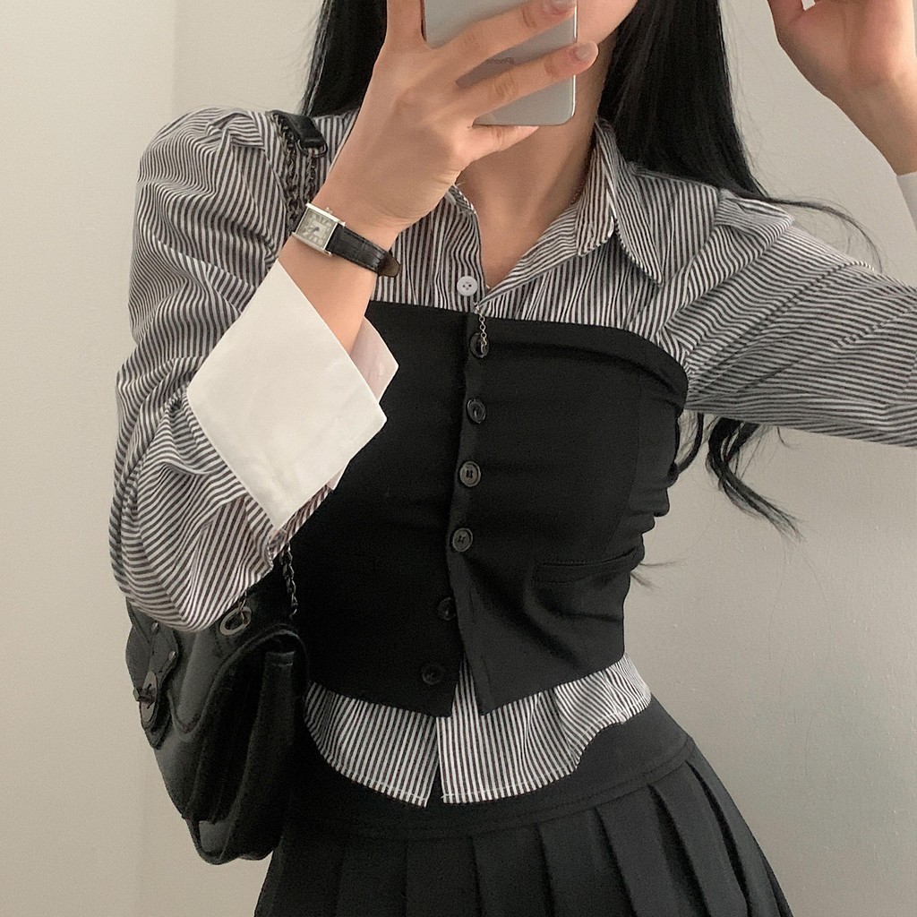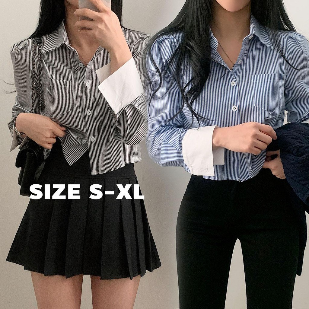 KOKO W322❤️เสื้อครอป เสื้อเชิ้ตแขนยาวลายทาง ผู้หญิง ปลายแขน 2 ชั้น ด้านหน้าสั้น หลังยาว ทรงหลวม แฟชั่น สไตล์เกาหลี