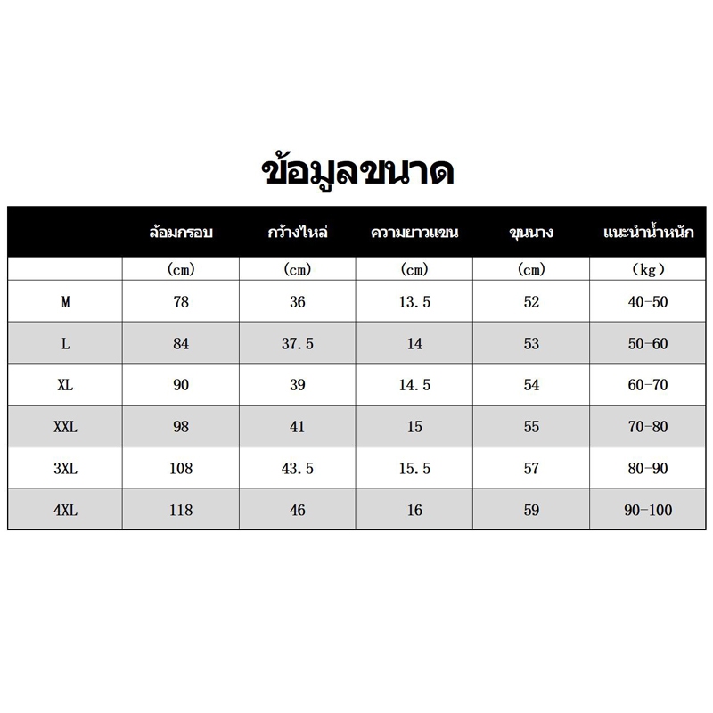 ... XL= หน้าอก90 ความยาวเสื้อ54 แขนยาว14.5 XXL= หน้าอก98 ความยาวเสื้อ55 แขนยาว15 3XL=หน้าอก108 ความยาวเสื้อ57 แขนยาว15.5 4XL=หน้าอก118 ความยาวเสื้อ59 แขนยาว16 ▷▷▷เนื่องจากการตรวจสอบที่แตกต่างกันและผลกระทบแสง สีจริงของสินค้าอาจจะแตกต่างจากสีที่แสดงในรูปภาพ ขอบคุณครับ ▷▷▷หากสินค้าของเราไม่ได้มีขนาดสีโปรดของคุณหรือคุณต้องการที่จะเรียนรู้เพิ่มเติมเกี่ยวกับข้อมูลโปรดติดต่อเราขอขอบคุณ ▷▷▷โปรดให้2 - 5cm วัดค่าจากการวัด ข้อผิดพลาด ▷▷▷ขนาดเอเชียมีขนาดเล็กกว่า EU / US / UK ขนาด**กรุณาดูรายละเอียดขนาดข้อมูลก่อนการซื้อ ขอบคุณ ▷▷▷ก่อนสั่งซื้หน้าอกรุณาตรวจสอบข้อมูลให้ถูกต้อง กรุณาเลืหน้าอกขนาดสีสันสินค้าที่เหมาะสม กรหน้าอกชื่อนามสกุลที่อยู่ผู้รับของและเบอร์โทรให้ละเอียดชัดเจนนะค่ะ