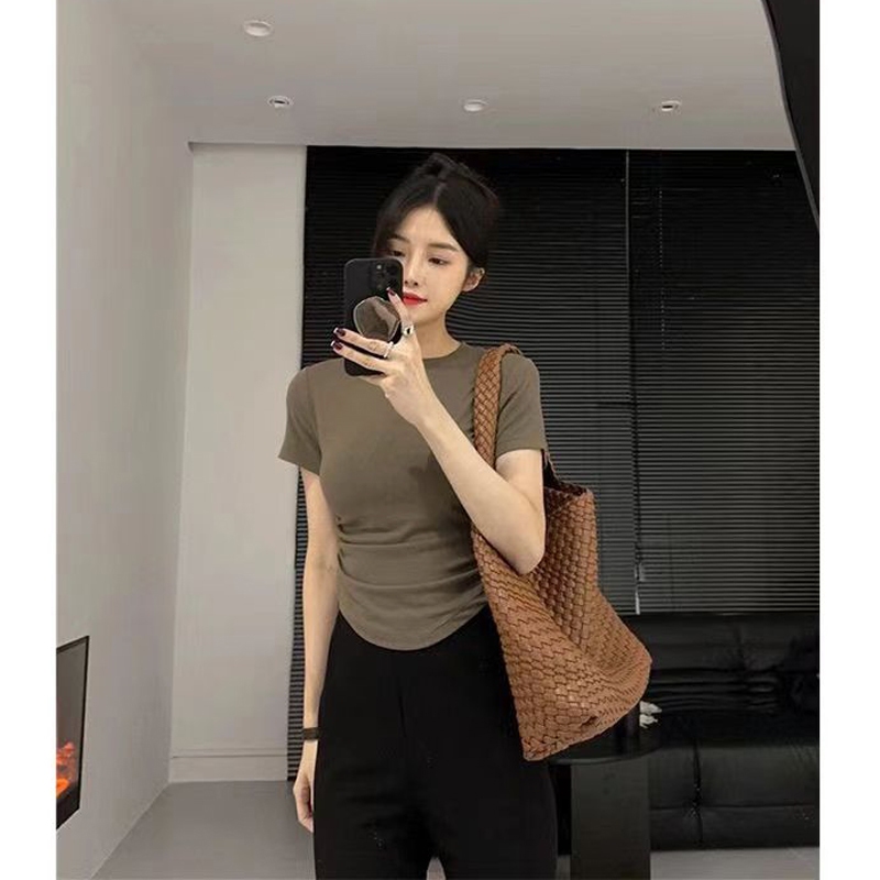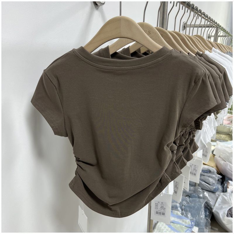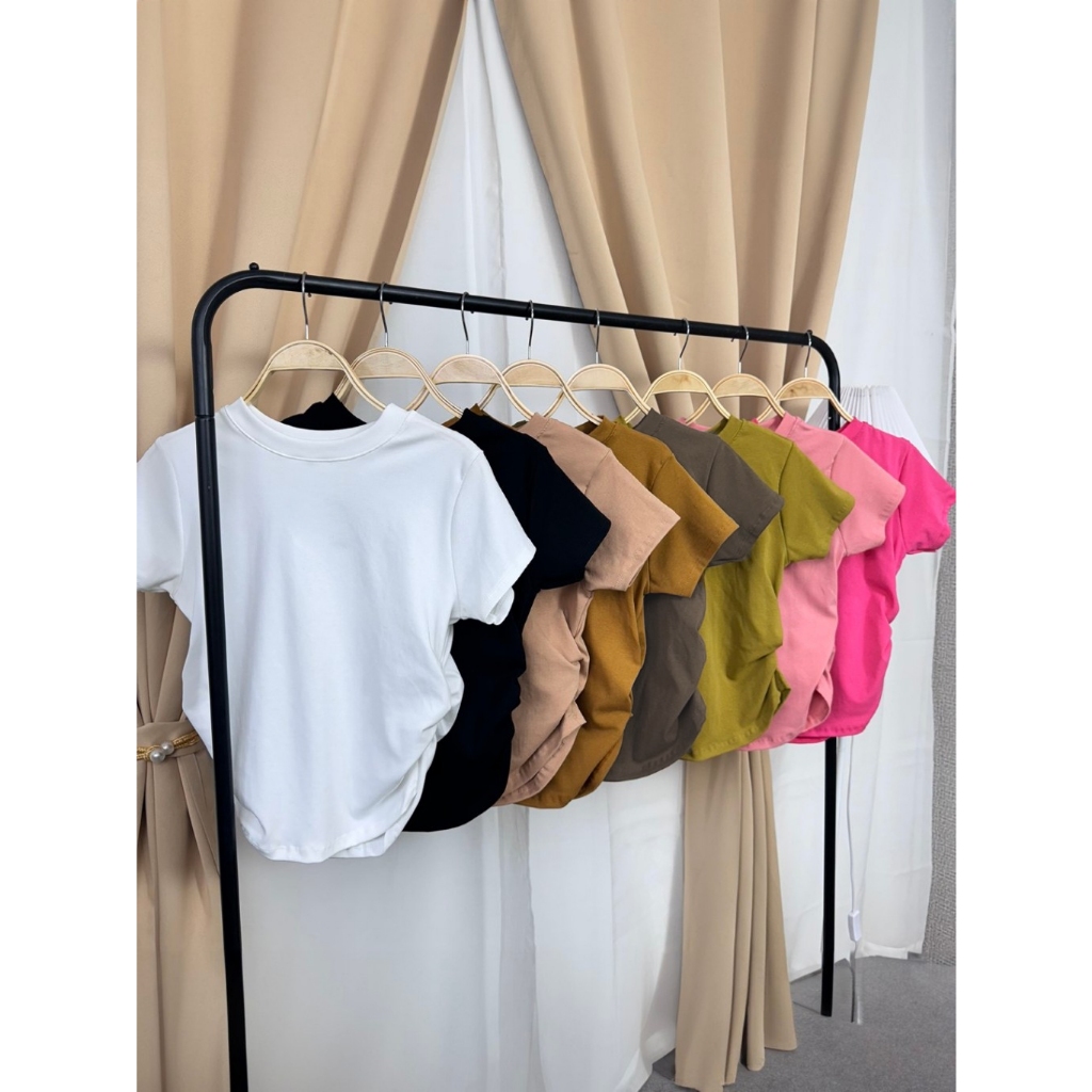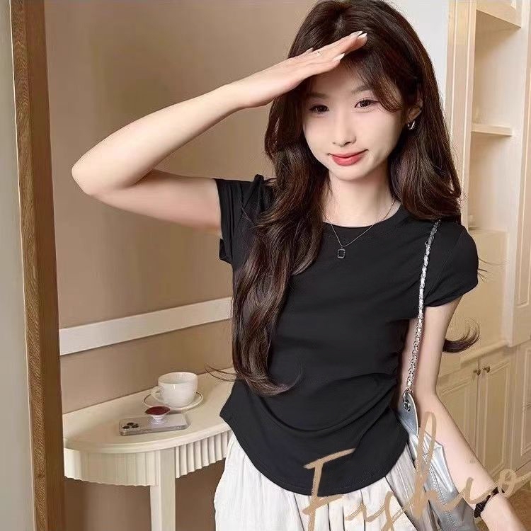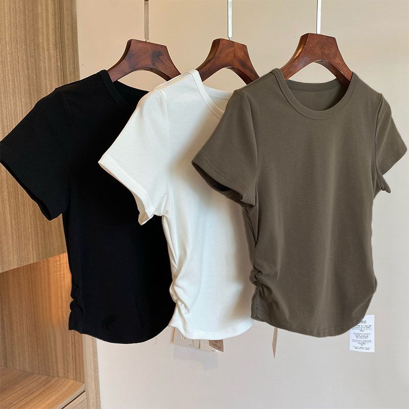 เสื้อยืดรัดรูปผู้หญิงสาวอวบ🌈เสื้อครอปแต่งย่นข้าง เสื้อยืดผู้หญิง คอกลมแขนสั้น สีทึบ แฟชั่น