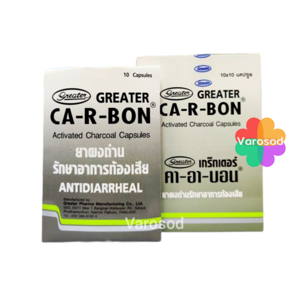 Ca-R-Bon Activated Charcoal Capsules 10 Cap คา อา บอน ผงถ่าน 10 แคปซูล (ยาสามัญประจำบ้าน) สรรพคุณ : ผงถ่านรักษาอาการท้องเสีย ท้องอืด ขนาดรับประทาน : - รับประทานก่อนหรือหลัง ยาอื่นๆ 2 ชั่วโมง - ผู้ใหญ่ และ เด็ก 12 ปีขึ้นไป ทานครั้งละ 3 - 4 แคปซูล วันละ 3 - 4 ครั้ง ยาสามัญประจำบ้าน เลขที่