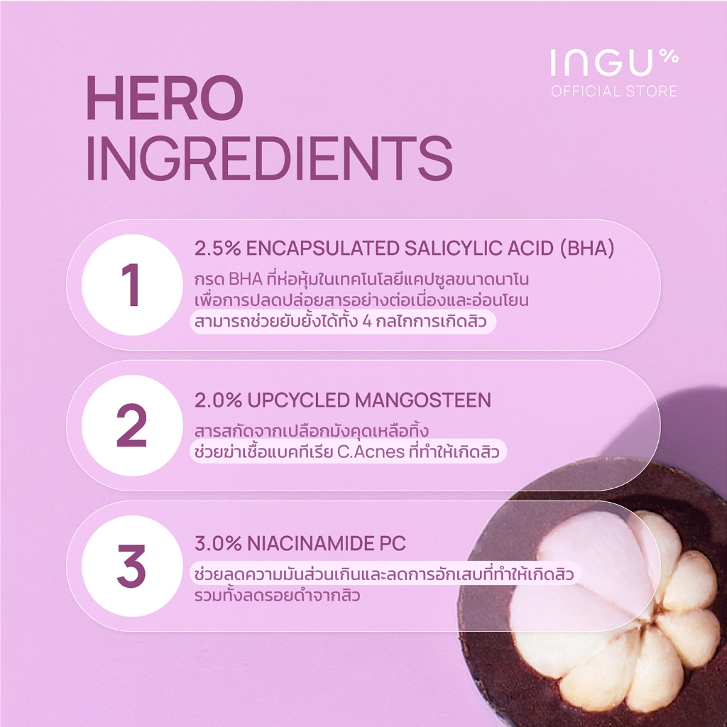 ... การเกิดสิวอย่างตรงจุด ด้วย Encapsulated Salicylic นวัตกรรม Time-Released ที่ช่วยปลดปล่อย BHA ที่มีประสิทธิภาพได้อย่างตรงจุดและยาวนาน ช่วยผลัดเซลล์ผิวอย่างอ่อนโยน มีส่วนผสมของสารสกัดจากเปลือกมังคุด Upcycled Mangosteen มีฤทธิ์ยับยั้ง C.Acne ที่ก่อให้เกิดสิว รวมทั้ง SebulessTM ช่วยควบคุมความมันที่เป็นสาเหตุอันก่อให้เกิดสิว PacifeelTM มีส่วนช่วยปลอบประโลมผิว เสริมสร้างเกราะป้องกันผิวและ Niacinamide PC ที่ช่วยเรื่องความสม่ำเสมอของสีผิว Hero Ingredients: Upcycled Mangosteen 2.0% สารสกัดจากเปลือกมังคุดที่อุดมไปด้วยสารด้านอนุมูลอิสระ Alpha Mangosteen ช่วยปรับสมดุลและปลอบประโลมผิวและช่วยยับยั้งเชื้อ C.Acne ที่ก่อให้เกิดขึ้น โดยอัพไซเคิลมาจากอุตสาหกรรมผลิตน้ำผลไม้ เพื่อสร้างคุณค่าใหม่ให้แก่เปลือกมังคุดเหลือทิ้ง และเพิ่มรายได้ให้เกษตรกร Encapsulated Salicylic Acid (BHA) 2.5% นวัตกรรม Time-Released ที่ช้วยปลดปล่อย BHA ที่มีประสิทธิภาพได้อย่างตรงจุดและยาวนาน ช่วยผลัดเซลล์ผิวที่ทับถมอย่างอ่อนโยน Niacinamide PC 3% ช่วยลดความแดง และรอยดำเสริมเพราะป้องกันผิว ปรับผิวให้แลดูกระจ่างใส PacifeelTM 1.5% กระตุ้นการสร้าง Ceramide เพิ่มความแข็งแรงต่อผิวหนังชั้นนอก ปกป้องผิวจากการระคายเคือง SebulessTM 0.5% อุดมไปด้วยสารต้านอนุมูลอิสระอย่าง Verbascoside ช่วยปรับสมดุลผิวหนัง และช่วยควบคุมความมัน All Ingredients List: Deionized water, Propanediol, Glycerin, Niacinamide, Garcinia Mangostana Peel Extract, Hydrolyzed Jojoba Esters, Panthenol, PEG-8, Butylene Glycol, Hydroxyethyl Acrylate/Sodium Acryloyldimethyl Taurate Copolymer, Silica, Polyacrylate Crosspolymer-6, Salicylic Acid, Triethanolamine, Maltodextrin, Syringa Vulgaris (Lilac) Extract, Mirabilis Jalapa Extract, Olive Oil PEG-7 Esters, Phenoxyethanol, Disodium EDTA, Chlorphenesin. วิธีใช้: ใช้ทาบริเวณผิวหน้าและผิวกายที่เป็นสิว วันละ 2-3 ครั้ง คำเตือน: 1. ผลิตภัณฑ์เครื่องสำอางใช้เฉพาะภายนอกเท่านั้น 2. อ่านวิธีใช้ให้ละเอียดและปฏิบัติตามอย่างเคร่งครัด 3. ควรทดสอบผลิตภัณฑ์ก่อนใช้ หากใช้แล้วมีความผิดปกติใด ๆ เกิดขึ้น ต้องหยุดใช้และปรึกษาแพทย์ หรือเภสัชกร 4. ห้ามใช้ในเด็กอายุต่ำกว่า 3 ปี ***ผลลัพท์ที่ได้ขึ้นอยู่กับสภาพผิวของแต่ละคน การแพ้ เป็นอาการเฉพาะบุคคล ควรอ่านและศึกษาข้อมูลอย่างละเอียดและปฏิบัติตามอย่างเคร่งครัด รายละเอียดสำหรับลูกค้าที่ต้องการขอใบกำกับภาษี - สำหรับลูกค้าที่ต้องการใบกำกับภาษี สามารถแจ้งแอดมินผ่านช่องแชทภายใน 24 ชั่วโมงหลังจากสั่งซื้อเท่านั้น - ใบกำกับภาษีจะถูกจัดส่งใบกำกับภาษีผ่านทางอีเมลของลูกค้าภายใน 15 วันทำการ ***รูปภาพและข้อความจากทางแบรนด์ถือเป็นลิขสิทธิ์ ไม่อนุญาตให้คัดลอกและนำไปใช้ต่อในเชิงพาณิชย์ หากพบเห็นจะดำเนินคดีทางกฎหมาย***