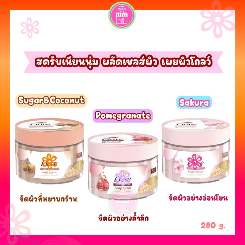 ... ำคล้ำ ผิวไม่สม่ำเสมอ ต้องการผลัดเซลส์ผิวให้เรียบเนียน กระจ่างขึ้น เช่น บริเวณหัวเข่า ข้อศอก ก้น 🥥มีส่วนผสมของน้ำมันมะพร้าว AHA บำรุงผิว ล้างออกแล้วผิวเนียนนุ่ม ไม่แห้งตึง ผิวกระจ่างใสเรียบเนียน 🥥กลิ่นหอมละมุน หวานนิดๆของ coconut 🥥ล้างออกง่าย สะอาด กลิ่นหอมติดผิว ผลิตภัณฑ์สครับทำความสะอาดขัดผิวกาย ครั้งแรก เนื้อสครับเนียนนุ่มคล้ายไอศกรีม อ่อนโยนต่อผิว ผสานAHA สกัดจากธรรมชาติช่วยให้ผิวเนียนนุ่ม ชุ่มชื้น ดูกระจ่างใส และ 1/4 มอยส์เจอไรเซอร์เพิ่มความชุ่มชื้น เม็ดสครับช่วยขจัดเซลล์ผิวชั้นนอกที่เสื่อมสภาพได้อย่างอ่อนโยนเพื่อผิวโกลว์เนียนนุ่ม --- 🌸 โดฟ สูตรซากุระ บอดี้ สครับ 💖ตัวเม็ดสครับเป็นเม็ดบีทขนาดเล็ก เหมาะกับขัดบริเวณ แขน ขา ลำตัว หรือผู้ที่ชอบเม็ดสครับไม่หยาบมาก ผลัดเซลส์ผิวให้กระจ่างใส โกลว์ เนียนนุ่ม 💖มีส่วนผสม ไนอะซินาไมค์ เพื่อให้ผิวกระจ่างใส สม่ำเสมอไม่แห้งตึง เพิ่มความชุ่มชื้นให้ผิวอย่างอ่อนโยน 💖กลิ่นแนวดอกไม้หอมหวาน ลุคสาวหวาน ตัวหอมน่ากอด 💖ล้างออกง่าย สะอาด กลิ่นหอมติดผิว ผลิตภัณฑ์สครับทำความสะอาดขัดผิวกาย ครั้งแรก เนื้อสครับเนียนนุ่มคล้ายไอศกรีม อ่อนโยนต่อผิว ผสานไนอะซินาไมด์เอสเซนส์เพื่อผิวดูกระจ่างใส และ 1/4 มอยส์เจอไรเซอร์เพิ่มความชุ่มชื้น เม็ดสครับช่วยขจัดเซลล์ผิวชั้นนอกที่เสื่อมสภาพได้อย่างอ่อนโยนเพื่อผิวโกลว์เนียนนุ่ม --- 💗โดฟ สูตรพอมมากราเนท บอดี้ สครับ 💜มีส่วนผสมของวิตามินอี ลดจุดด่างดำ เพิ่มความชุ่มชื้นให้ผิวเนียนนุ่ม 💜กลิ่นออกแนวฟรุ้ตตี้ ผลไม้ ลุคสาวขี้เล่น 💜ล้างออกง่าย สะอาด กลิ่นหอมติดผิว ผลิตภัณฑ์สครับทำความสะอาดขัดผิวกาย ครั้งแรก เนื้อสครับเนียนนุ่มคล้ายไอศกรีม อ่อนโยนต่อผิว ผสานวิตามิน อี คอมเพล็กซ์ ช่วยเสริมเกราะปกป้องและความชุ่มชื้นแก่ผิว และ 1/4 มอยส์เจอไรเซอร์เพิ่มความชุ่มชื้น เม็ดสครับช่วยขจัดเซลล์ผิวชั้นนอกที่เสื่อมสภาพได้อย่างอ่อนโยนเพื่อผิวโกลว์เนียนนุ่ม วิธีใช้: ลูบไล้สครับทั่วผิวกายเน้นบริเวณศอก เข่า และข้อเท้า แล้วล้างออก สามารถใช้โดฟครีมอาบน้ำหลังการสครับเพื่อการทำความสะอาดที่ล้ำลึก เหมาะสำหรับใช้เป็นประจำทุกวัน