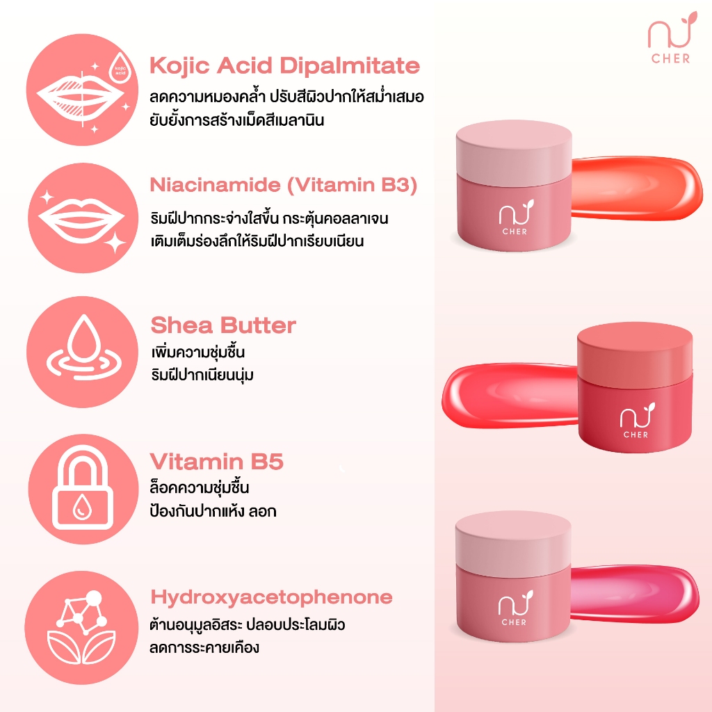 ... มฝีปากให้อมชมพู แลดูสุขภาพดี กระจ่างใสขึ้น สีริมฝีปากดูสม่ำเสมอ กระตุ้นการสร้างคอลลาเจนให้ริมฝีปากอวบอิ่ม กระชับ ต้านอนุมูลอิสระ ปลอบประโลมผิว ลดการระคายเคือง และเพิ่มความชุ่มชื้น แก้ปากแตก ด้วย Vitamin B5 และ Shea Butter ✅ 🤰🏻คนท้อง 🤱🏻 ให้นมบุตรสามารถใช้ได้ 🚫ไม่มีสารกันเสียทุกชนิด 🚫ไม่มีแอลกอฮอล์ 🚫ไม่มีน้ำหอม 🚫ไม่มีซิลิโคน Active Ingredients 1.Kojic Acid Dipalmitate ลดความหมองคล้ำ ปรับสีผิวปากให้สม่ำเสมอ ยับยั้งการสร้างเม็ดสีเมลานิน 2.Niacinamide (วิตามินบี 3) ริมฝีปากกระจ่างใสขึ้น กระตุ้นคอลลาเจน เติมเต็มร่องลึกให้ริมฝีปากเรียบเนียน 3.Butyrospermum Parkii (Shea Butter) เพิ่มความชุ่มชื้น ริมฝีปากเนียนนุ่ม 4.DL-Panthenol (วิตามินบี 5) ล็อคความชุ่มชื้น ป้องกันปากแห้ง ลอก 5.Hydroxyacetophenone ต้านอนุมูลอิสระ ปลอบประโลมผิว ลดการระคายเคือง มี 3 สี ❤️14 Friendly ❤️15 Happy ❤️16 Lover ขนาด 8 g วิธีใช้ : ทาให้ทั่วบริเวณริมฝีปากเป็นประจำทุกวันก่อนนอน หรือใช้เติมระหว่างวัน Tips : ใช้ประจำอย่างต่อเนื่อง เพื่อผลลัพธ์ที่ดี INGREDIENTS/ส่วนประกอบ : HYDROGENATED POLYISOBUTENE, BUTYROSPERMUM PARKII (SHEA BUTTER), BEESWAX, DEIONIZED WATER, ACACIA DECURRENS/JOJOBA/SUNFLOWER SEEDCERA/POLYGLYCERYL-3 ESTERS, NIACINAMIDE, DL-PANTHENOL, KOJIC ACID DIPALMITATE, 1,2-HEXANEDIOL, HYDROXYACETOPHENONE, METHYLPROPANEDIOL, ETHYLHEXYLGLYCERIN May Contain : CI 45410, CI 15850 เลขที่ใบรับจดแจ้ง : 10-1-6700006227