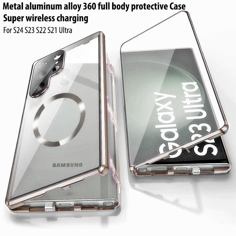 เคสโทรศัพท์มือถือกระจกนิรภัยแข็ง แบบแม่เหล็ก สองด้าน ด้านหน้า และด้านหลัง 360 องศา สําหรับ Samsung Galaxy S23 S24 S22+ S22plus Ultra