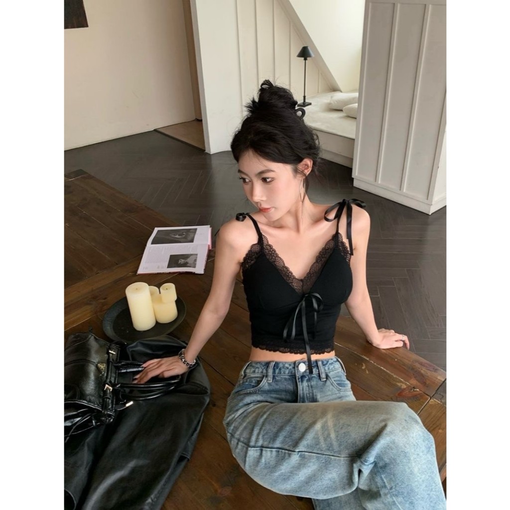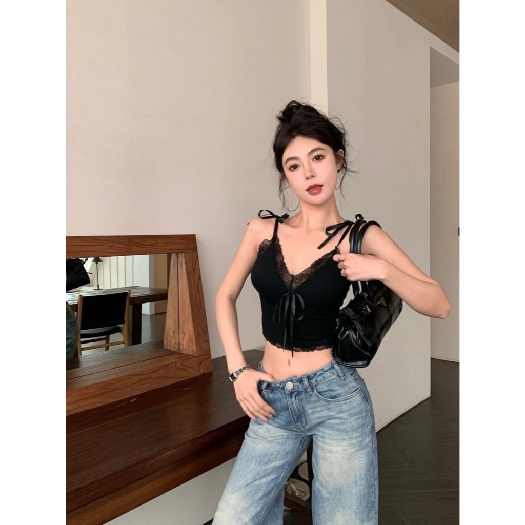 🌟B-264🌟เสื้อสายเดี่ยวขอบลูกไม้ สายผูก ดีเทลโบว์ มีฟองน้ำในตัว 🌟