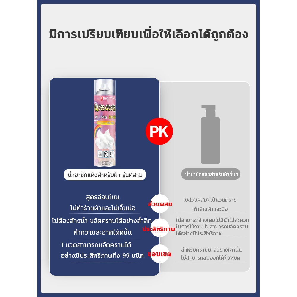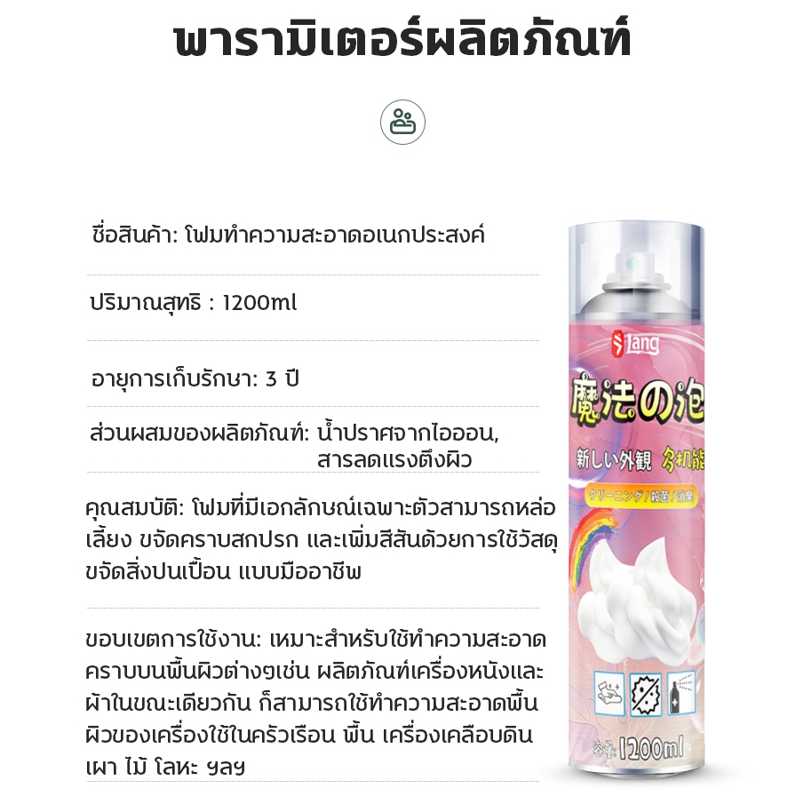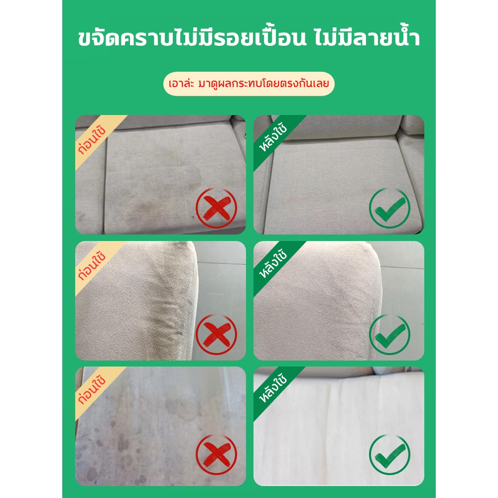 ... คราบน้ำมัน คราบน้ำผลไม้ คราบเลือด คราบฝุ่น คราบปัสสาวะ คราบซีอิ๊ว คราบนม ฯลฯ 🔧วิธีการใช้งาน🔧 ขั้นตอนที่ 1 เขย่าผลิตภัณฑ์เบาๆก่อนใช้ เพื่อให้น้ำยาผสมให้เข้ากัน และสารออกฤทธิ์ ขั้นตอนที่ 2 หมุนหัวฉีดไปที่ ON หงายขึ้น ในสถานะ "ฉีด" ฉีดสเปรย์พื้นผิวที่เปื้อน ปล่อยให้ 1-2 นาที ใช้แปรงขัดเพื่อให้เกิดโฟม ทำให้ย่อยสลายได้เต็มที่ ขั้นตอนที่ 3 ขัดไปทางเดียว หลังขัด ใช้ผ้าขนหนูชุบน้ำอุ่นหมาดๆเช็ดแห้ง น้ำยาทำความสะอาดพื้นผิวตกค้าง หลีกเลี่ยงการทิ้งลายน้ำ ขั้นตอนที่ 4 หลังทำเสร็จ ไม่ต้องล้างน้ำ ปล่อยให้แห้งธรรมชาติ หรือเป่าให้แห้งด้วยเครื่องเป่าผม ❗❗ข้อควรระวัง❗❗ 1. ตัววัสดุที่สีซีดจางได้ง่ายและไม่สามารถเปียกน้ำได้ โปรดใช้บริเวณที่ไม่เด่น ทำการทดลองก่อน 2. จัดการคราบฝังแน่น ซับคราบด้วยผ้าจุบน้ำร้อนก่อน ทำให้คราบอ่อนตัวลง แล้วทำความสะอาดตามปกติ 3.ไม่แนะนำให้ใช้โดยตรงหลังทำความสะอาด ปล่อยทิ้งไว้ 10-15 นาทีแล้วรอให้แห้งก่อนใช้งาน
