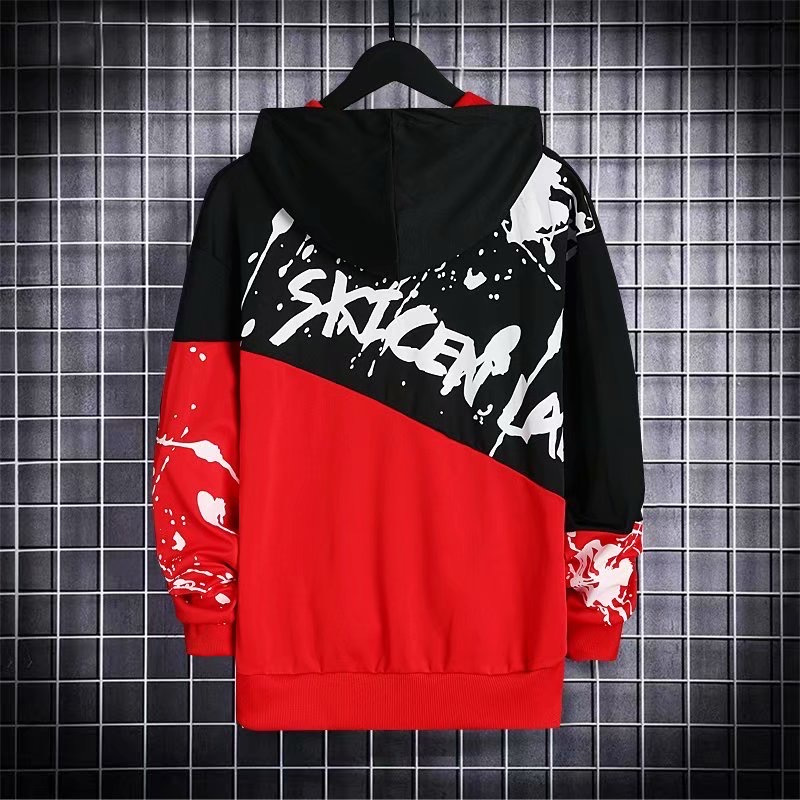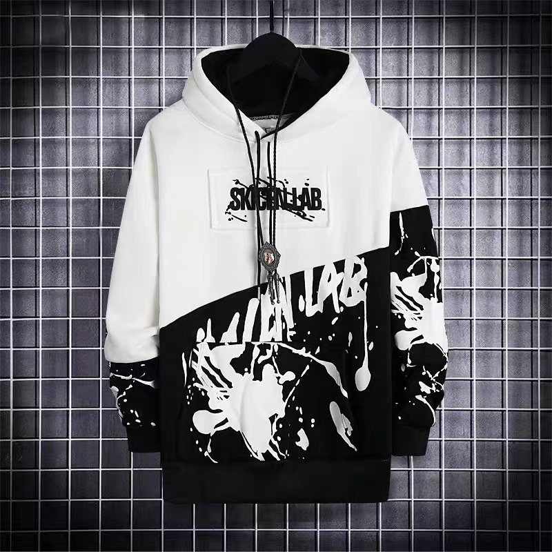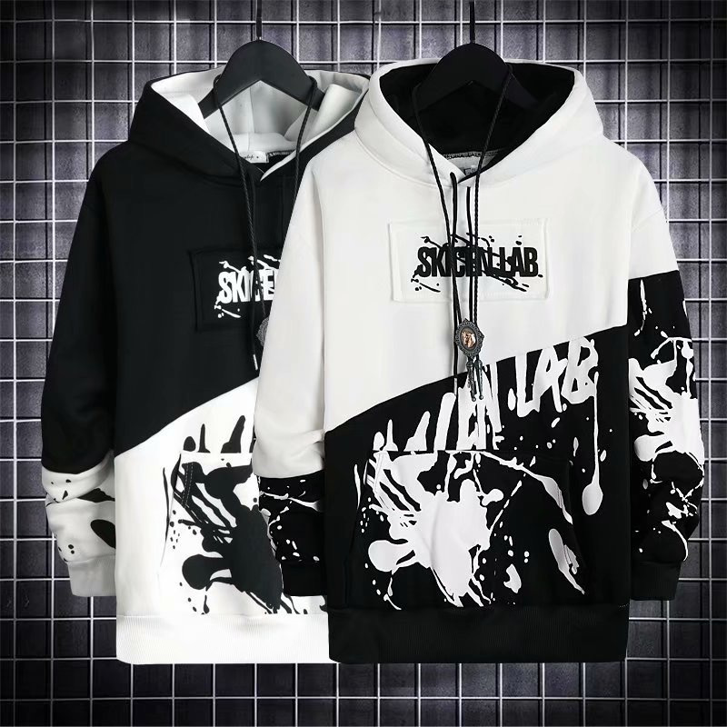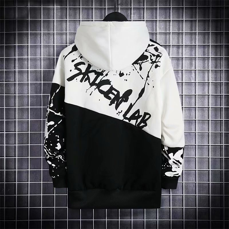 เสื้อฮู้ดแฟชั่นผู้ชายสีดำและสีขาวเย็บคู่เสื้อฮู้ดตัวอักษรสบายๆ ขนาดบวกเสื้อ