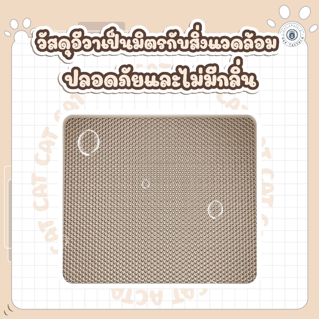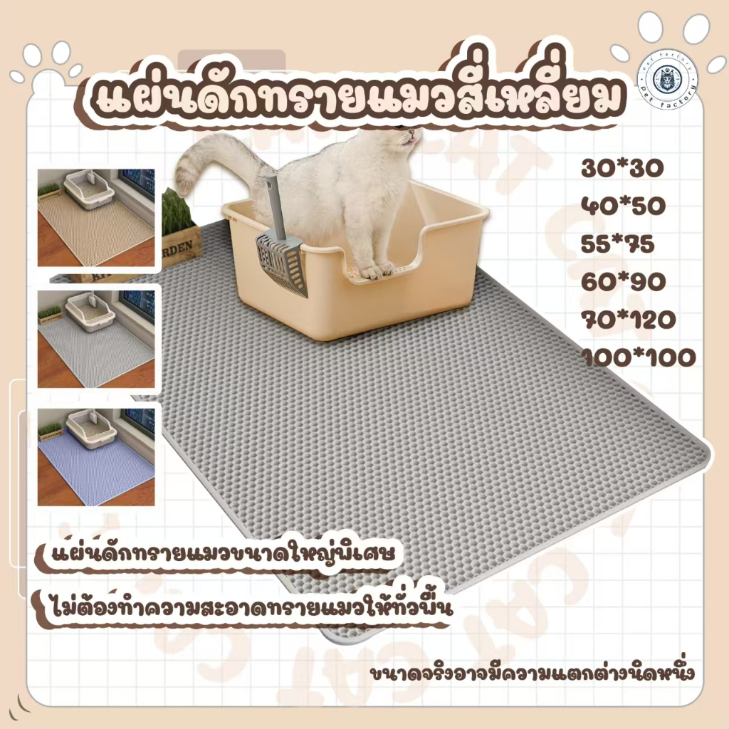 สี : สีฟ้า🩵 สีกากี🤎 สีเทา ขนาด: 1. 40×50cm 2. 55×75cm 3. 60×90cm 4. 70*120cm 5. 70×70cm 6. 100×100cm - ทำจากอีวาทนทาน ปลอดสารพิษ. - การออกแบบเว้า-นูนสามารถยึดทรายในอุ้งเท้าของแมวได้อย่างมีประส