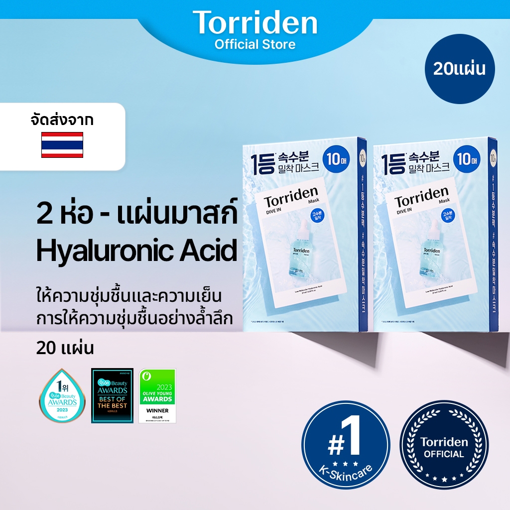 [2 ห่อ][Torriden Official] DIVE IN แผ่นมาร์คหน้าเซรั่มกรดไฮยาลูโรนิกโมเลกุลต่ำ, แผ่นมาร์คหน้าชีทชุ่มชื้นสำหรับใช้เป็นประจำทุกวัน, 20 แผ่น