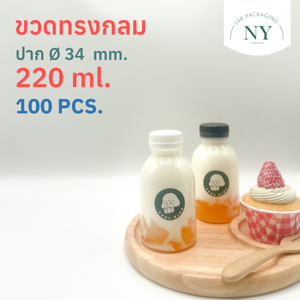 (แพ็ค 100 ใบ)ขวดทรงกลม ปาก 34 mm. ขวด pet 220 ml.(ขายพร้อมฝา มีให้เลือกสีขาว/ดำ)NY168 Packaging