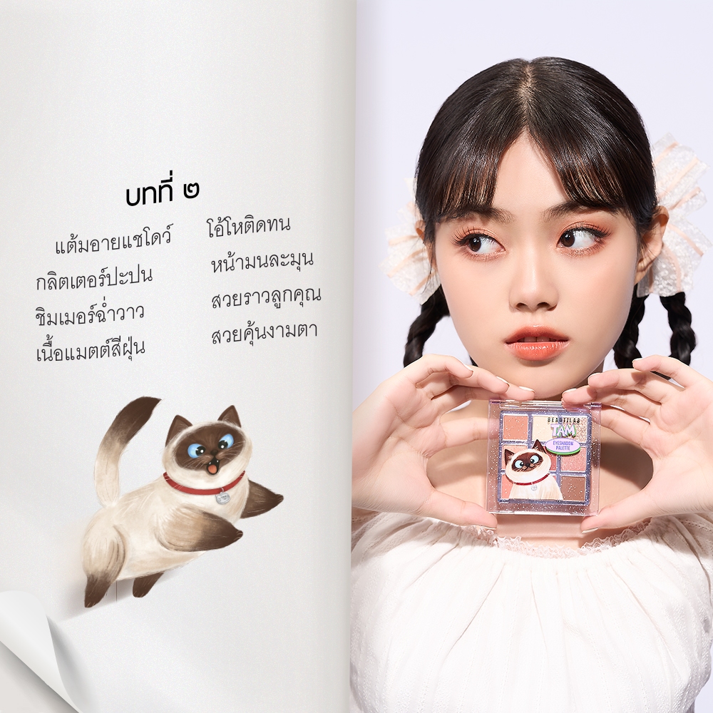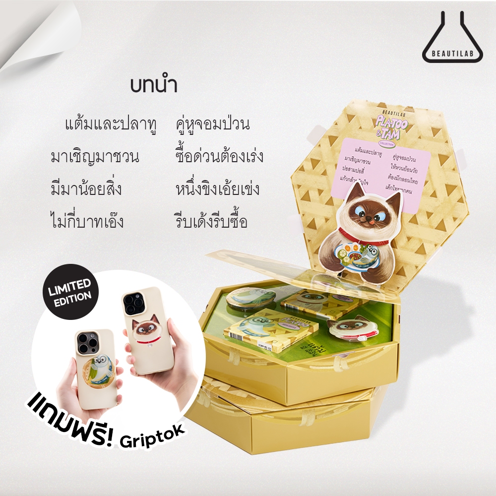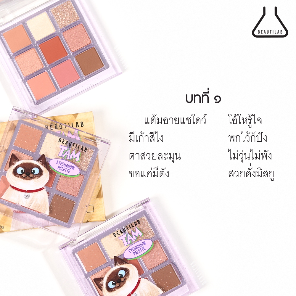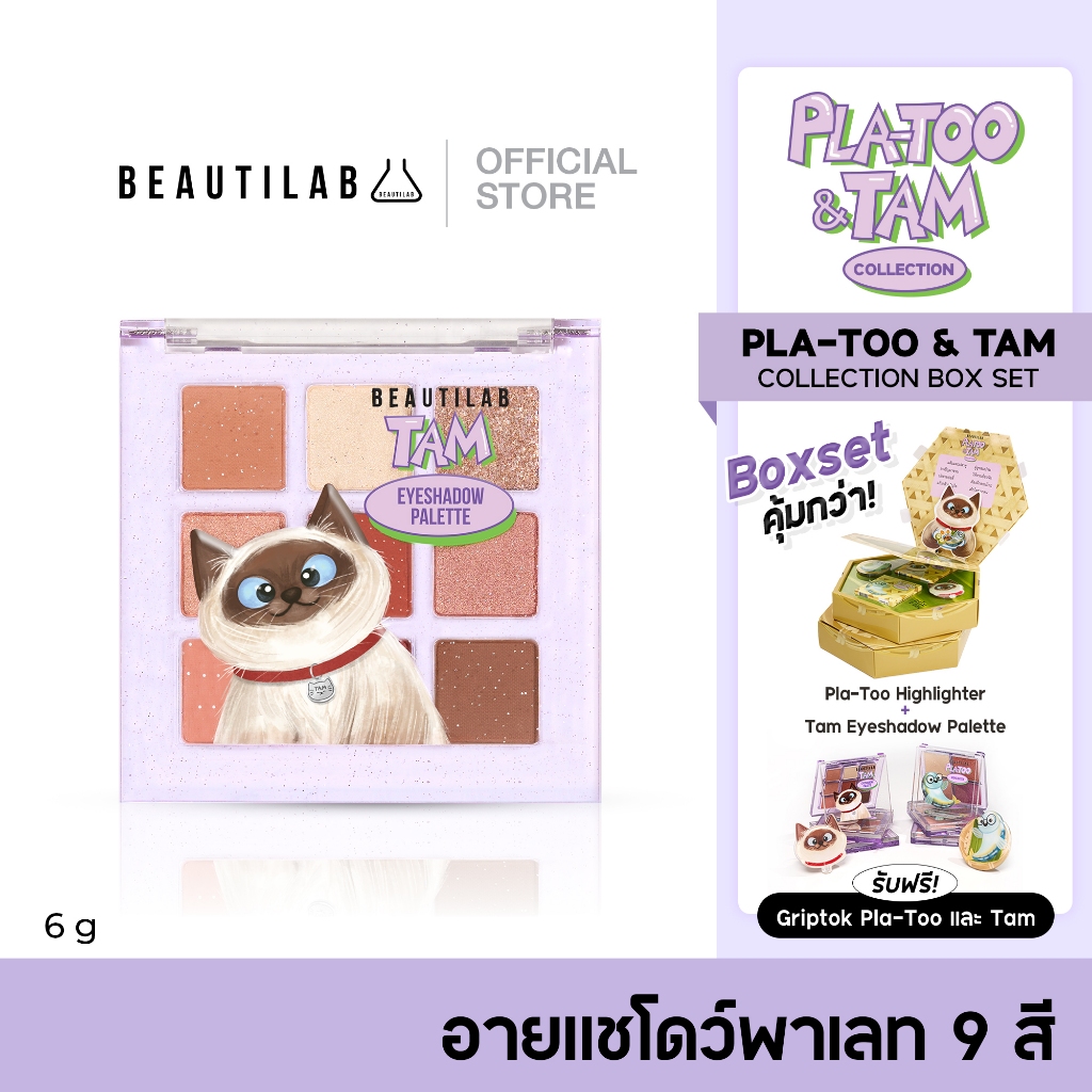 ... ตได้หลายลุค 01 - สีน้ำตาลอมส้ม 02 - สีขาวมุก 03 - สีน้ำตาลทองกลิตเตอร์ *สีกลิตเตอร์จะมีความ fall out แนะนำให้ใช้นิ้ว Tap เบาๆ เพียงเล็กน้อย จากนั้น Top-Up กลางเปลือกตา 04 - สีชมพูอมส้มชิมเมอร์ 05 - สีแดงอมน้ำตาล 06 - สีชมพูอมน้ำตาลชิมเมอร์ 07 - สีชมพู 08 - สีชมพูอมน้ำตาล 09 - สีน้ำตาลแดง 🌟🌟🌟 พิเศษจำนวนจำกัด!! BEAUTILAB PLA-TOO & TAM COLLECTION BOXSET🌟🌟🌟 ชวนย้อนวันวาน พร้อมหวนให้คิดถึงความทรงจำหนังสือเรียนวัยเด็ก👼🏼 ด้วยดีไซน์กล่องและคาแรคเตอร์ที่ถูกออกแบบมาเฉพาะสำหรับบิวตี้แลป พร้อมแจกความน่ารักสุดคิ้ววว กับคอลเลคชั่นปลาทู&แต้ม ที่จะมาช่วยสร้างสีสัน เพิ่มความเปล่งประกายให้กับใบหน้าของคุณ ด้วยกล่องพรีเมี่ยมที่ได้รับแรงบันดาลใจมาจากเข่งปลาทู อีกหนึ่งคาแรคเตอร์ที่สะท้อนถึงฟินิชงานผิวฉ่ำวาว ดูมีมิติของ Pla-Too Highlighter แต้มสีสันด้วยพาเลทแมวแต้มสุดกวน (Tam Eyeshadow Palette) ที่มีให้เลือกถึง 9 สีวอร์มโทน เสกดวงตาให้สวยคลาสซี่ ดูน่าหลงใหล ภายในกล่องยังมี Griptok ลายแต้มและปลาทูที่พร้อมอวดความน่ารักที่สุดในโลกกกก มาให้ถึงอย่างละ 1 ชิ้น ในราคาสุดคุ้มเพียง 699 บาท จำกัดแค่ 1,500 เซ็ทเท่านั้น ภายในเซ็ทมีสินค้ามูลค่าถึง 996 บาท!! - Beautilab Tam Eyeshadow Palette มูลค่า 399 - Beautilab Pla-Too Highlighter มูลค่า 399 - Tam Griptok มูลค่า 99 - Pla-Too Griptok มูลค่า 99