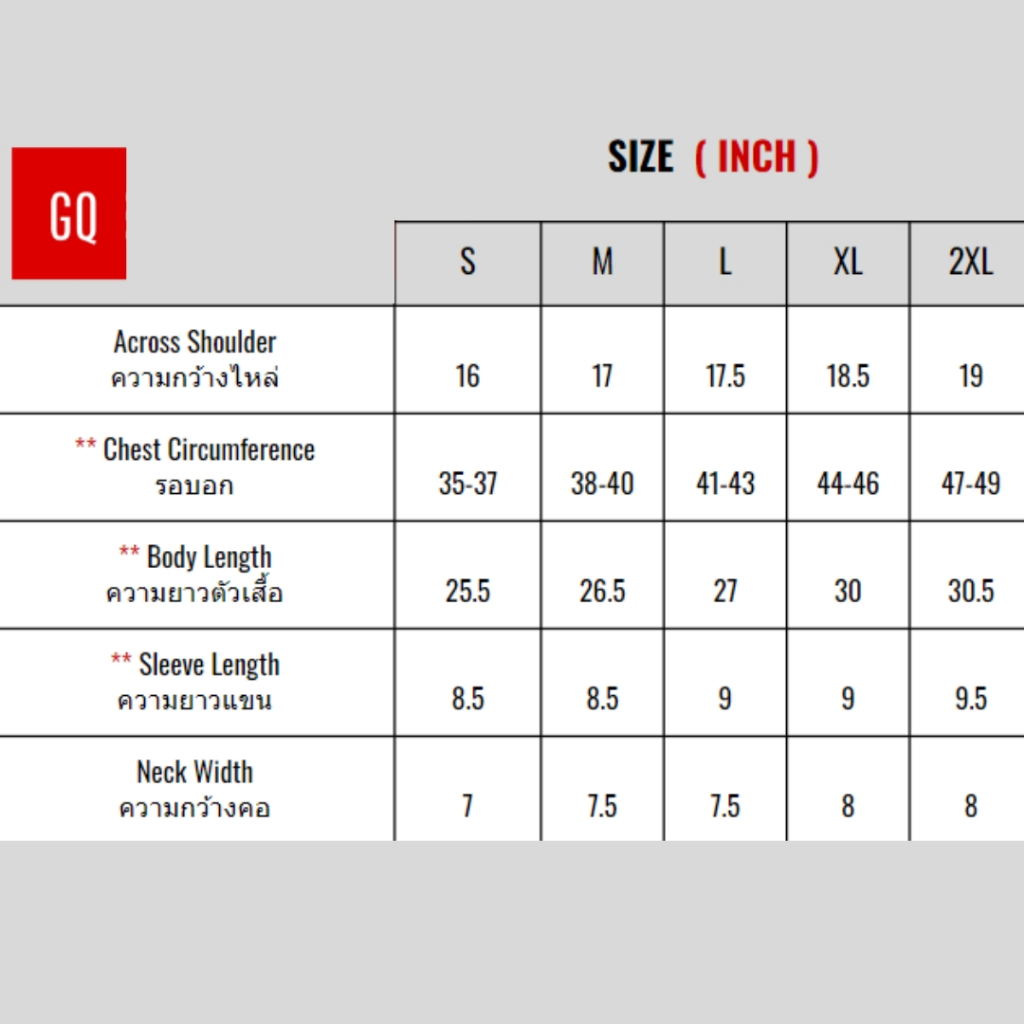 GQ เสื้อกีฬา เสื้อบอล เสื้อวิ่ง แห้งไว ระบายอากาศได้ดี ใส่สบาย ใส่อยู่บ้านได้ ใส่นอนได้ ใส่ตื่นก็ได้ ขนาดรอบออกของแต่ละไซซ์ - S: 35 - 37 นิ้ว - M: 38 - 40 นิ้ว - L: 41 - 43 นิ้ว - XL: 44 - 46 นิ้ว