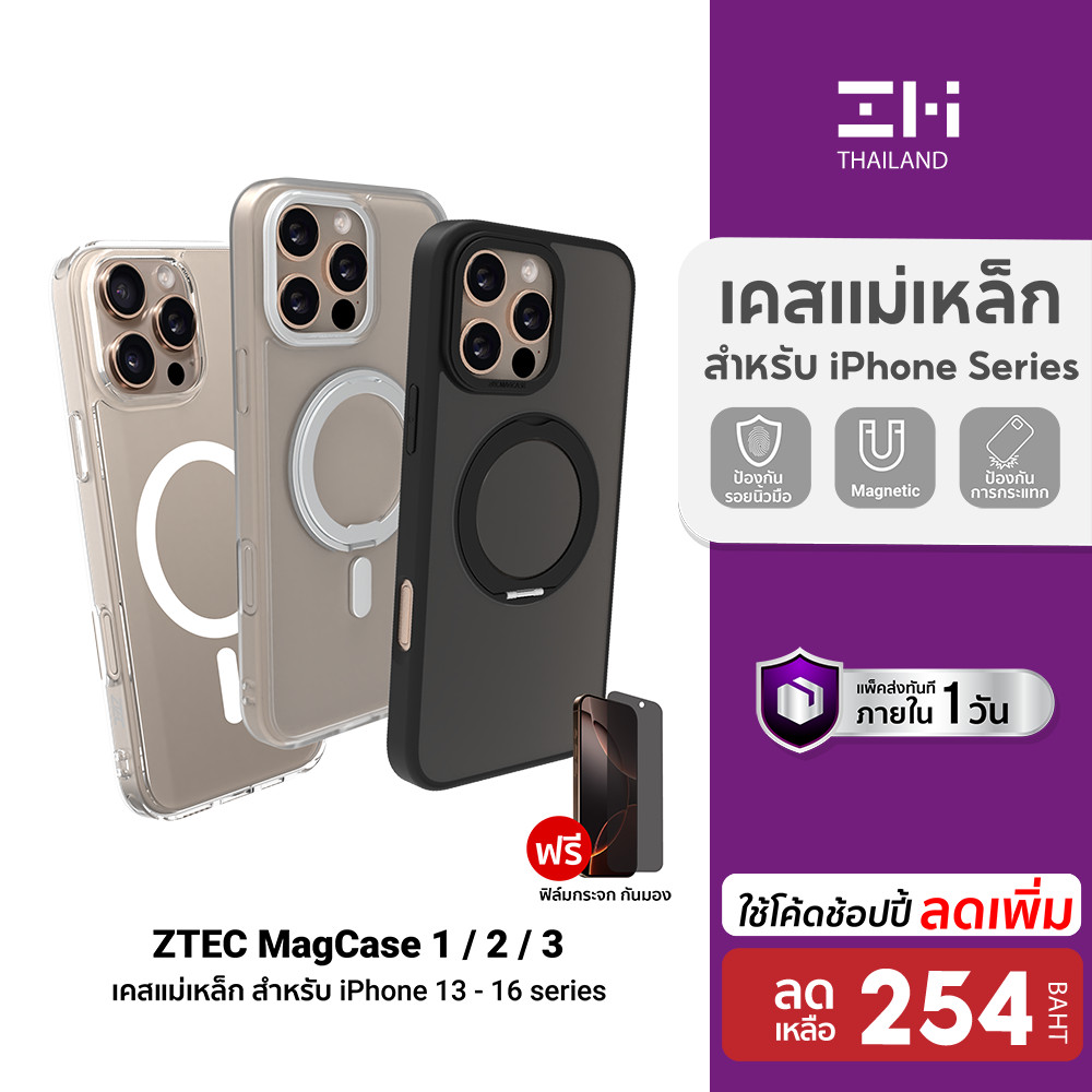 ... ] - วัสดุ TPU Silicone คุณภาพสูง ยืดหยุ่น ซับแรงกระแทกได้ดีเยี่ยม * ปุ่ม Silicone นุ่มกดง่าย ไม่ต้องใช้แรงในการกดเยอะ * เสริมการป้องกันหน้าจอด้วยการยกขอบหน้าจอให้หนาเป็นพิเศษ - ใส่ใจทุกรายละเอียด ด้วยดีไซน์ที่เพรียวบาง ช่วยให้จับถนัดมือมากขึ้น - Airbag Anti-Rall เพิ่มการป้องกันมุมของตัวเครื่องทั้ง 4 จุด - แม่เหล็กแรงดูดสูง ติดแน่น ป้องกันการหลุดระหว่างใช้งานได้เป็นอย่างดี - ตำแหน่งของแม่เหล็ก ตรงกับแผงรับไฟของแต่ละรุ่นได้อย่างพอดี - เข้าได้กับทุกอุปกรณ์ Mag Safe ทั้งสายชาร์จ และแบตสำรอง - ป้องกันเลนส์กล้องได้ดีกว่า ขนาดพอดี และไม่ติดขอบภาพเวลาถ่าย - รองรับการผ่านของกำลังไฟได้อย่างเต็มประสิทธิภาพ และไม่ลดกำลังไฟ - ใสเคลียร์เป็นพิเศษ ดึงความสวยงานของตัวเครื่องได้อย่างเต็มที่ - ช่องลำโพง และพอร์ตชาร์จ เจาะมาได้อย่างพอดิบพอดี (ไม่เอียง) - แถมฟรีฟิล์มกระจกกันคนส่อง (ตรงรุ่นกับรุ่นที่เลือกซื้อ) [[ ข้อมูลสินค้า ]] แบรนด์ : ZTEC รุ่น : ZTEC MagCase 1 Protective Case วัสดุ : TPU Silicone [[ อุปกรณ์ภายในกล่อง ]] 1x เคส (ตามรุ่น / สีที่ซื้อ) 1x ฟิล์มกันคนมอง ------------------------------- 2.) ZTEC MagCase 2 / 3 เคสแม่เหล็ก แถมฟรีฟิล์มกันมอง ใช้สำหรับรุ่น Phone 13 / 14 / 15 series [[ จุดเด่นสินค้า ]] - วงแหวนแม่เหล็กสุดอเนกประสงค์ มาพร้อมพลังดูดที่สูง ยึดแกะได้แน่นกว่า * สามารถกางออก เพื่อใช้งานเป็นขาตั้ง ที่สามารถหมุนได้แบบ 360° * ใช้งานเป็นขาตั้งก็ได้ หรือจะใช้งานเป็นคล้องนิ้วกันโทรศัพท์หล่นก็ดี - ใช้แม่เหล็กที่มีแรงดูดที่สูงถึง 52N ให้แรงดูดที่มากกว่า หลุดยากมากยิ่งขึ้น * เคส Magnetic ทั่วไปจะมีแรงดูดของแม่เหล็กเพียง 12N - อุ่นใจมากยิ่งขึ้น ด้วยการเสริมด้วยกรอบโลหะ เพื่อป้องกันเลนส์กล้อง * ช่วยปกป้องเลนส์กล้องได้เป็นอย่างดี และไม่เกินขอบดำที่ภาพ เวลาถ่ายรูป - Airbag Anti-Rall ซับแรงตก และเพิ่มการป้องกันมุมของตัวเครื่องทั้ง 4 จุด [[ คุณสมบัติสินค้า ]] - บางเบากว่า ใช้งานได้สะดวกสบาย และคงขนาดเดิมของโทรศัพท์ให้มากที่สุด - รองรับการใช้งานที่หนักหน่วงได้สบาย แม้จะใช้กับขาจับแม่เหล็กในรถยนต์ - เสริมปุ่มเพิ่มเสียง , ลดเสียง และล็อกหน้าจอให้ใหญ่ขึ้น ใช้งานสะดวกกว่าเดิม * ปุ่มกดใช้วัสดุโลหะ ช่วยให้มีอายุการใช้งานที่ยาวนานกว่าปุ่มกดแบบยาง - ติดตั้งง่าย และพอดีกับตัวเครื่อง ช่วยลดปัญหาอาการเคสกัดขอบตัวเครื่อง - ดีไซน์เรียบหรู เข้ากับทุกสีของตัวเครื่อง ช่วยขับให้โทรศัพท์โดดเด่นมากยิ่งขึ้น - ช่องลำโพง และพอร์ตชาร์จ เจาะมาได้อย่างพอดิบพอดี (ไม่เอียง) แบรนด์ : ZTEC รุ่น : ZTEC MagCase 2 / 3 Protective Case วัสดุ : TPU Silicone + Metal [[ อุปกรณ์ภายในกล่อง ]] 1x เคส ZTEC MagCase 2 / 3 (ตามรุ่น / สีที่ซื้อ) 1x ฟิล์มกันคนมอง