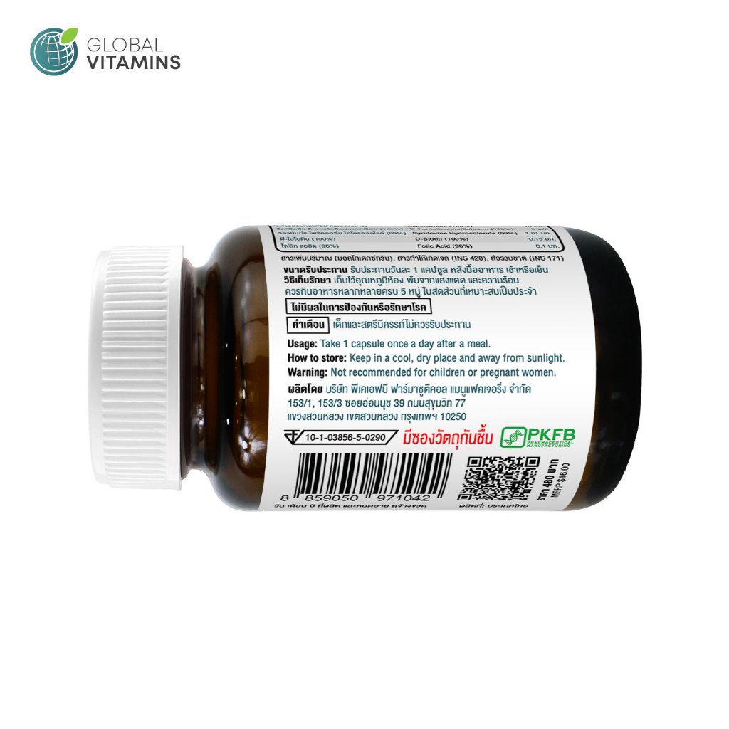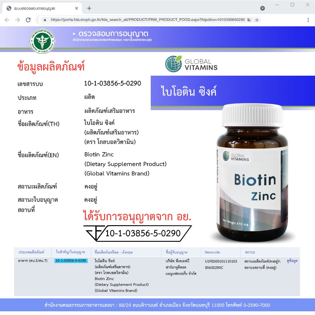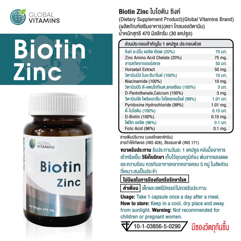 ... ำหน่ายทุกกรณี กิจกรรมสิ้นสุด 30 พฤศจิกายน 2567 (อัพเดทเนื้อหา 30 ส.ค. 2567) --------------------------------- Product Name: Biotin Zinc Brand: Global Vitamins ชื่อสินค้า: ไบโอติน ซิงค์ แบรนด์: โกลบอลวิตามิน 1 bottle contains 30 capsules 1 ขวด บรรจุ 30 แคปซูล ราคาปกติขวดละ 480 บาท MSRP: 480 THB เลขที่ อย. / THAI FDA: 10-1-03856-5-0290 Barcode: 8859050971042 การรับประทาน: รับประทานวันละ 1 แคปซูล หลังมื้ออาหาร เช้าหรือเย็น Usage : Take 1 capsule once a day after a meal. สารสำคัญต่อ 1 แคปซูล ซิงค์ อะมิโน แอซิด คีเลต (20%) 75 มก. สารสกัดจากฮอร์สเทล 50 มก. วิตามินบี3 ไนอะซินาไมด์ (100%) 10 มก. วิตามินบี5 ดี-แพนโททีเนต,แคลเซียม (100%) 3 มก. วิตามินบี6 ไพริดอกซีน ไฮโดรคลอไรด์ (99%) 1.01 มก. ดี- ไบโอติน (100%) 0.15 มก. โฟลิก แอซิด (96%) 0.1 มก. Active Ingredients per capsule Zinc Amino Acid Chelate (20%) 75 mg. Horsetail Extract 50 mg. Niacinamide (100%) 10 mg. D-Pantothenate,Calcium (100%) 3 mg. Pyridoxine Hydrochloride (99%) 1.01 mg. D-Biotin (100%) 0.15 mg. Folic Acid (96%) 0.1 mg. วิธีเก็บรักษา: เก็บไว้อุณหภูมิห้อง พ้นจากแสงแดด และความร้อน ควรกินอาหารหลากหลายครบ 5 หมู่ ในสัดส่วนที่เหมาะสมเป็นประจำ ไม่มีผลในการป้องกันหรือรักษาโรค คำเตือน: เด็กและสตรีมีครรภ์ไม่ควรรับประทาน ไบโอติน ซิงค์ Biotin Zinc สารสกัดจากหญ้าหางม้า หญ้าหางม้า ฮอร์สเทล