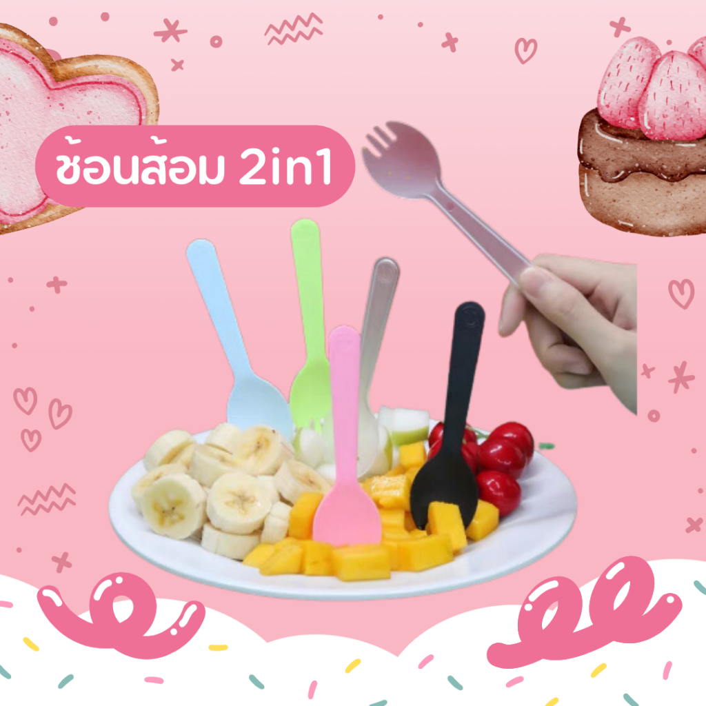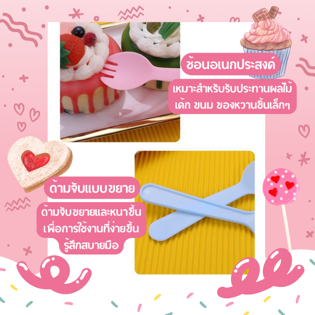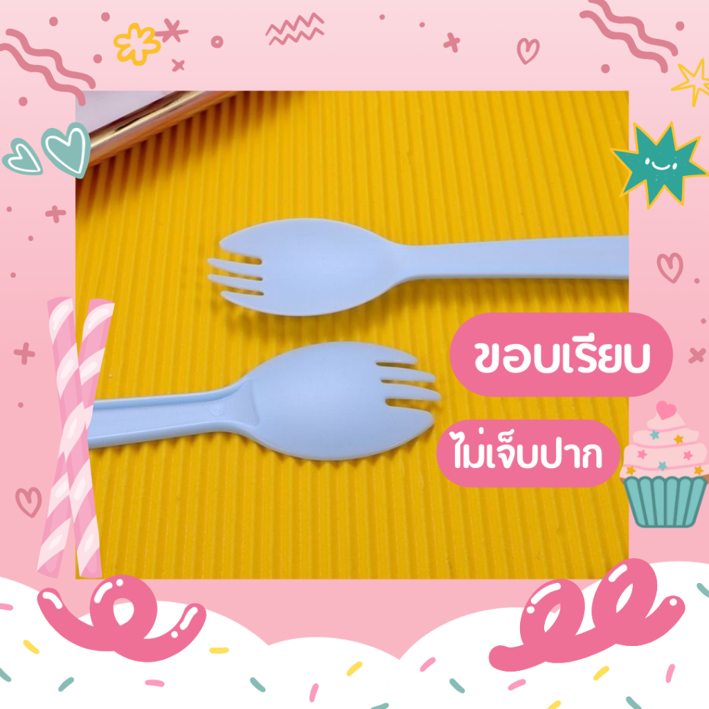 🍰 ช้อนพลาสติก ปลายส้อม ใช้แล้วทิ้ง 1 ซอง แพ็ค100 ชิ้น ใส่ถุงแยกทุกชิ้น สำหรับอาหาร ขนม เค้ก