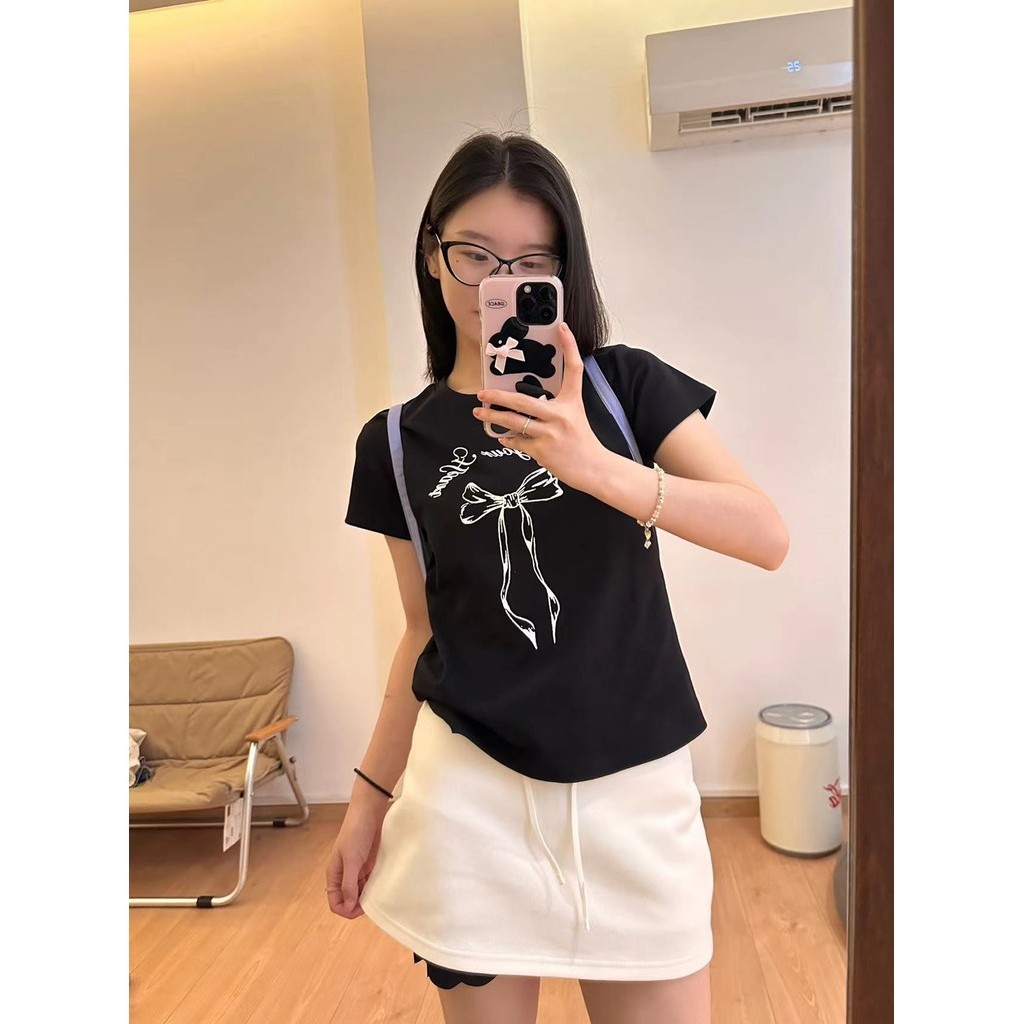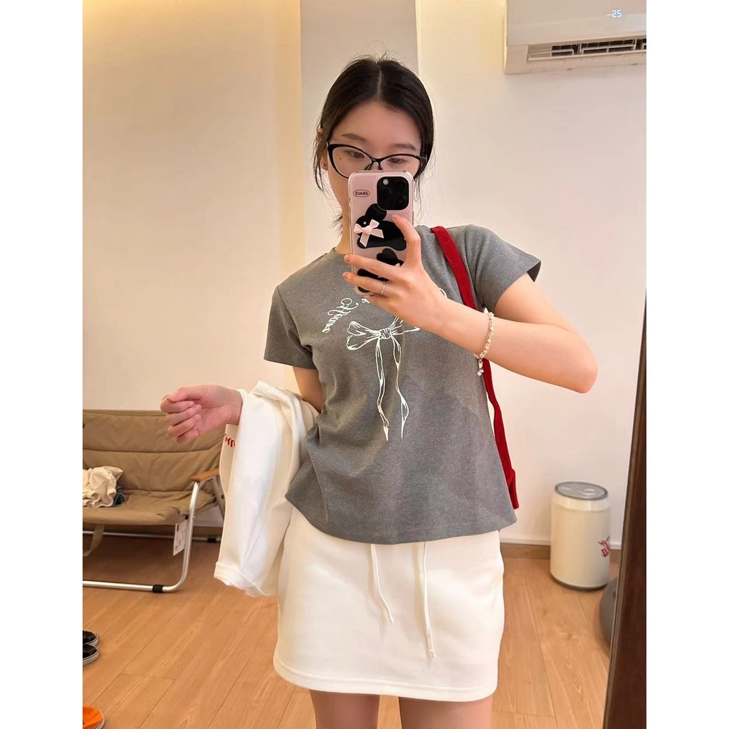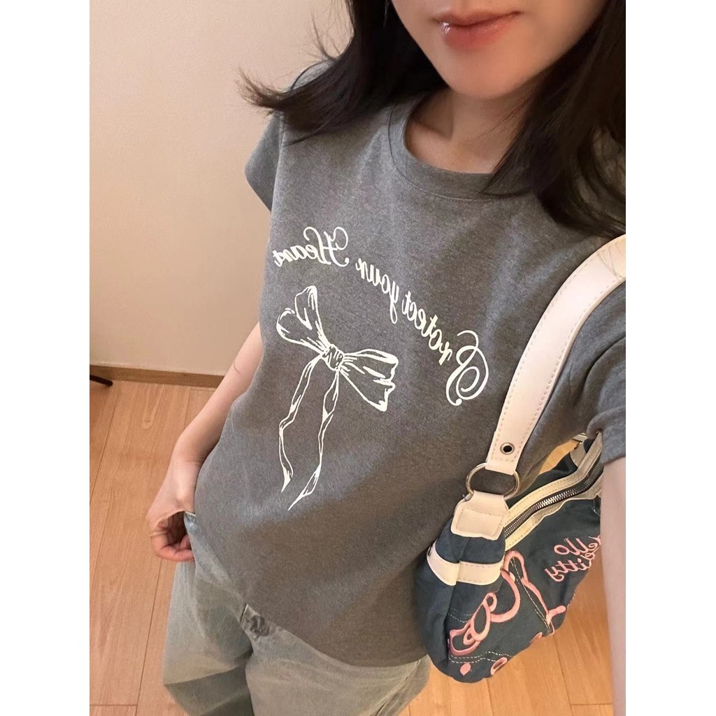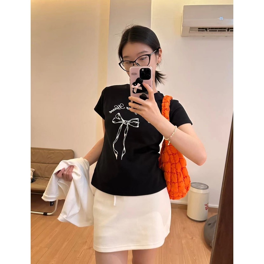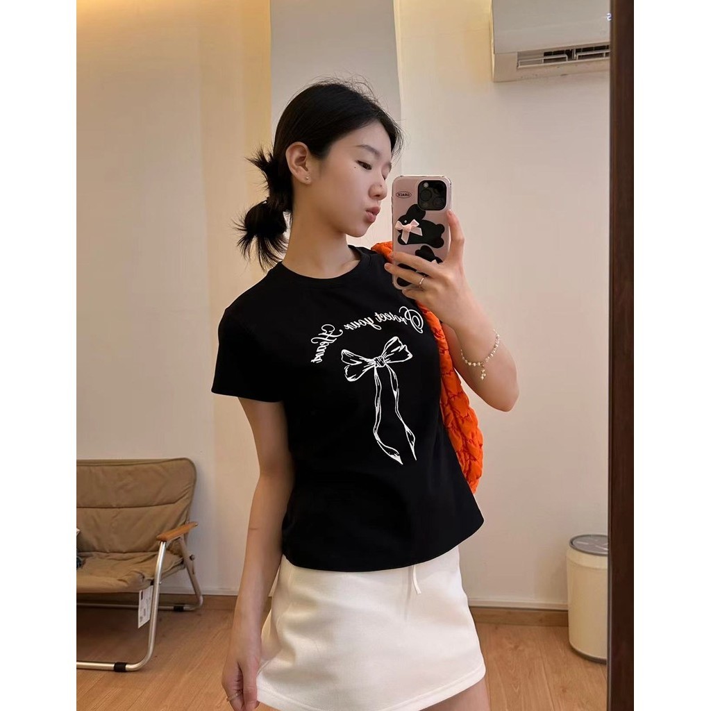 Hotgirl พร้อมส่ง✨เสื้อรัดรูป เสื้อยืดผู้หญิง แฟชั่นสวยๆผู้หญิง น่ารักแขนสั้น สไตล์เกาหลี พิมพ์ลายโบว์ฤดูร้อน