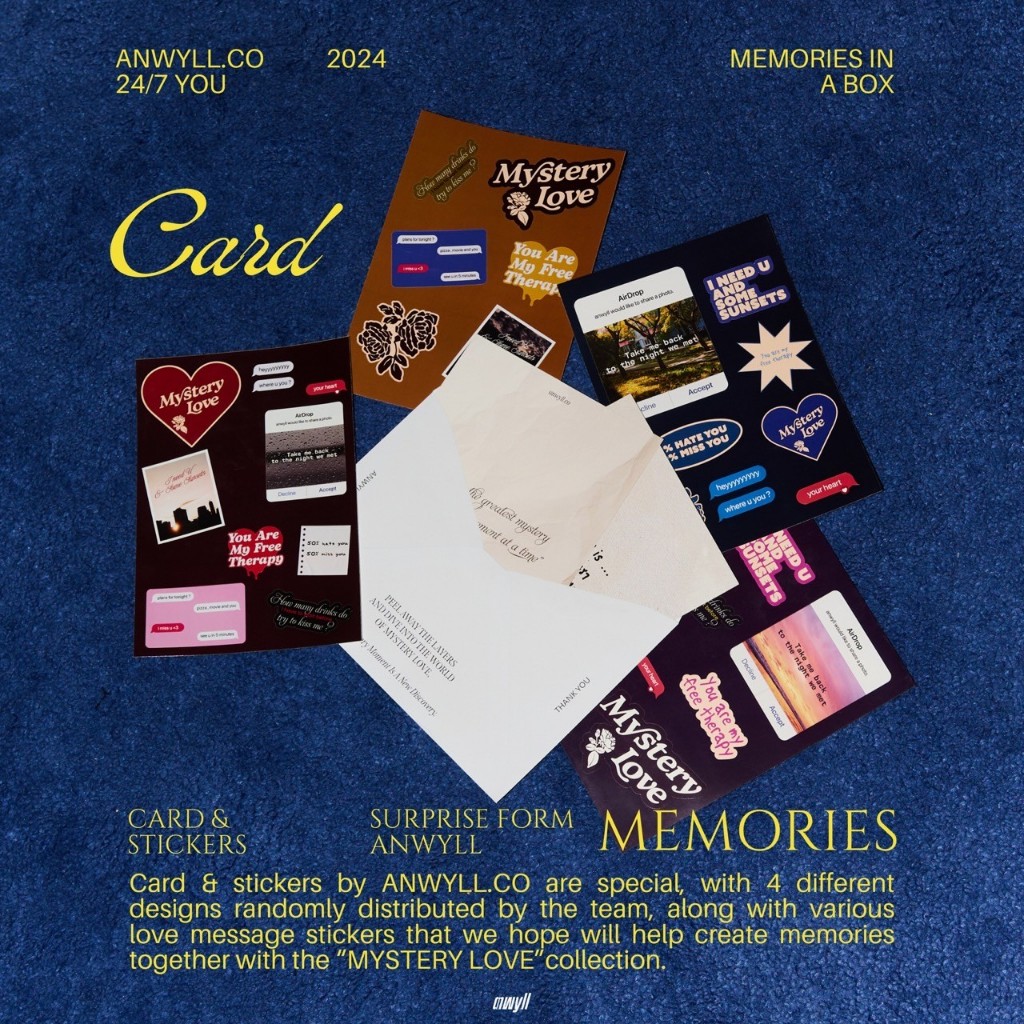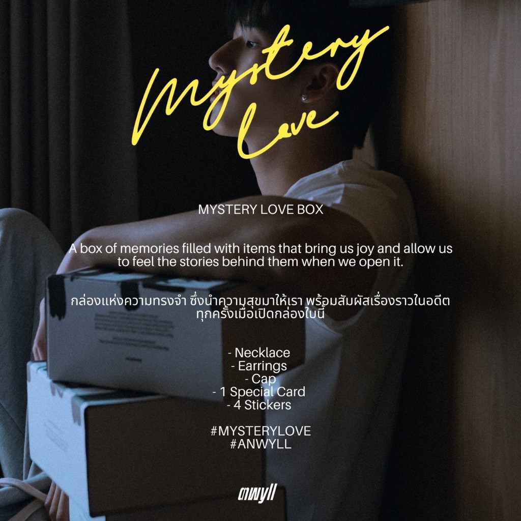 ANWYLL MYSTERY LOVE BOX A box of memories filled with items that bring us joy and allow us to feel the stories behind them when we open it. กล่องแห่งความทรงจำ ซึ่งนำความสุขมาให้เรา พร้อมสัมผัสเรื่องราวในอดีตทุกครั้งเมื่อเปิดกล่องใบนี้ - Necklace - Earrings - Cap - 1 Special Card - 4 Stick