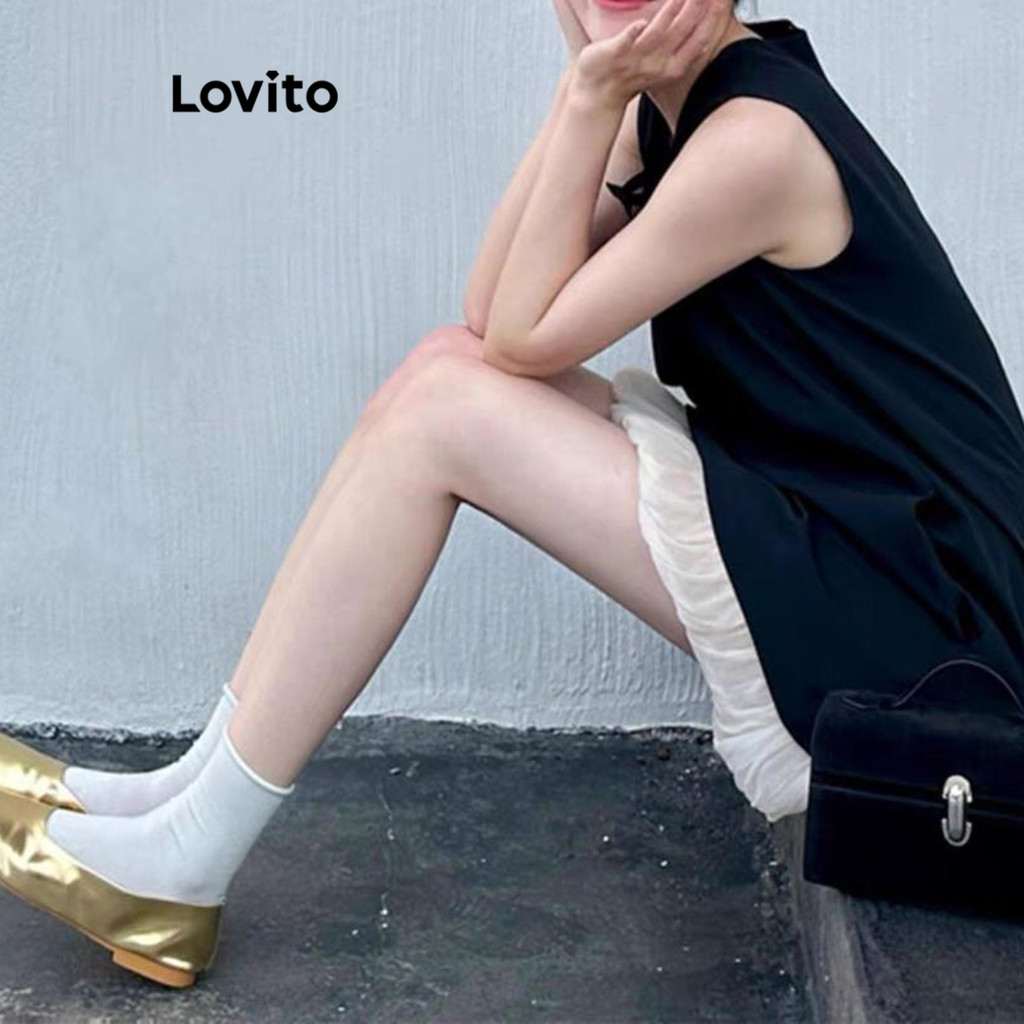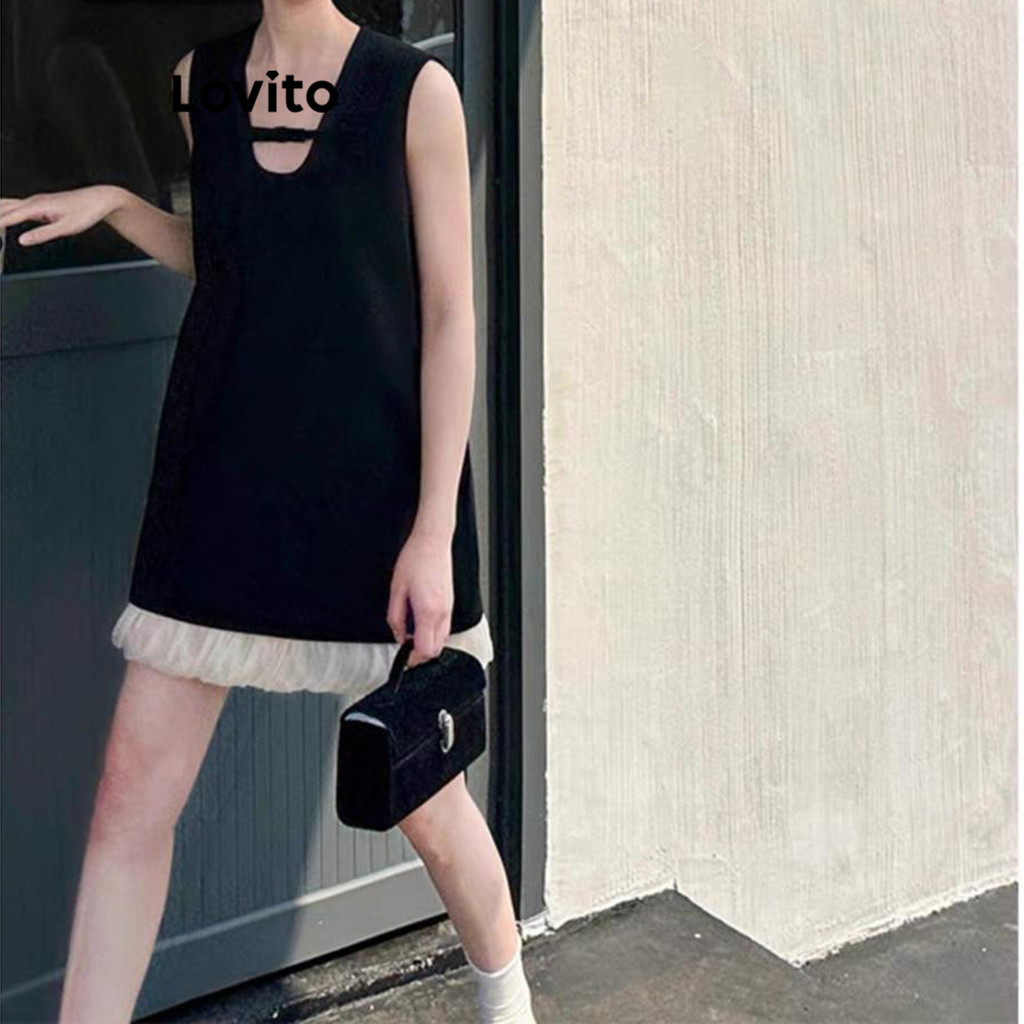 Lovito ชุดเดรสผู้หญิง แต่งผ้าตาข่าย สีพื้น สไตล์ลำลอง LNA66299