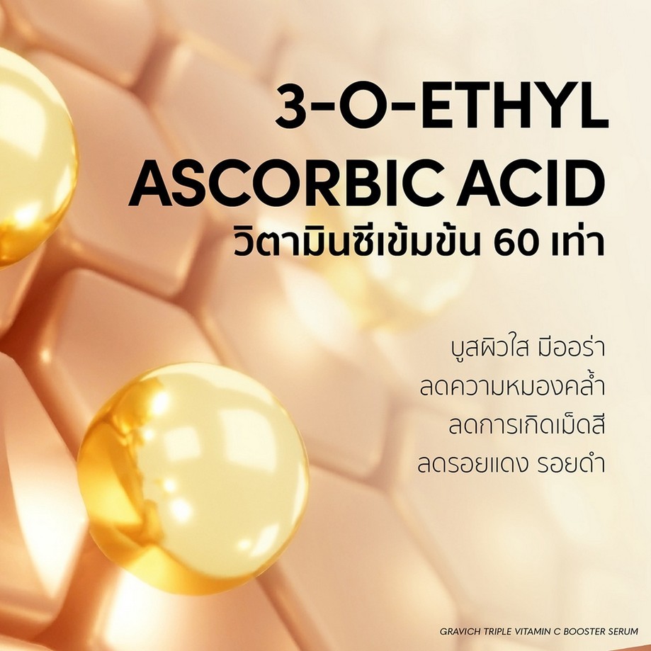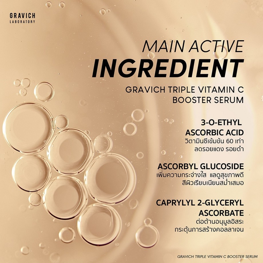 ... ค้ดส่วนลด 📢 กรอกโค้ด [ช้อปโค้ดส่วนลดจากช้อปปี้] 👉🏻 SEPNLAB1 ลดทันที 75.- เมื่อช้อปขั้นต่ำ 300.- 👉🏻 SEPNLAB2 ลดทันที 100.- เมื่อช้อปขั้นต่ำ 400.- 👉🏻 SEPNLAB3 ลดทันที 125.- เมื่อช้อปขั้นต่ำ 500.- *โค้ดมีจำนวนจำกัด ใช้ได้แค่ 1 โค้ด/คำสั่งซื้อ และโค้ดละ 1 สิทธิ์เท่านั้น กราวิช ทริปเปิ้ล วิตามินซี บูสเตอร์ เซรั่ม เซรั่มสูตรผิวกระจ่างใส ผิวไบร์ท ผิวเปล่งกระกาย ปรับสีผิวเข้มให้ใสขึ้น และยังช่วยแก้ปัญหา ผิวหมองคล้ำ สีผิวไม่สม่ำเสมอ มีจุดด่างดำ รวมทั้งรอยสิว รอยดำที่เกิดจากสิว ให้กลับมามีผิวขาวใส ไบร์ท ออร่า หน้าใสอย่างเป็นธรรมชาติ ขวดเดียวเห็นผลชัดเจน ✓ ผิวกระจ่างใส ไบร์ท ไม่ไวต่อแดด ✓ ปรับสีผิวให้กระจ่างใส โดยไม่ทำให้หน้าบางลง ✓ สีผิวเรียบเนียนสม่ำเสมอ ✓ ลดเลือนจุดด่างดำ รอยสิวหรือรอยแดงที่เกิดขึ้นจากการเกิดสิว ✓ ผิวเปล่งปลั่ง อิ่มน้ำ เต่งตึง ✓ ผิวสุขภาพดี ไม่แห้งกร้าน ✓ ลดการระคายเคืองบนผิวหนังเมื่อต้องสัมผัสกับแสงแดด รวม Active Ingredients สำหรับผู้มีปัญหาผิวคล้ำเสีย ต้องการปรับสีผิวให้กระจ่างใส ไร้รอยด่างดำ ผิวเปล่งปลั่ง มีออร่า โดยสูตรเฉพาะของ GRAVICH TRIPLE VITAMIN C ที่รวมที่สุดวิตามินซี อนุพันธ์เข้นข้น และบริสุทธิ์มารวมไว้ในขวดเดียว TRIPLE VITAMIN C สูตรเฉพาะที่ได้รับการคิดค้นจากผู้เชี่ยวชาญว่า “มีประสิทธิภาพสูงกว่า” วิตามินซีทั่วไป 10 เท่า เมื่อเทียบกับผลิตภัณฑ์อื่น ๆ > 3-O-ETHYL ASCORBIC ACID > ASCORBYL GLUCOSIDE > CAPRYLYL 2-GLYCERYL ASCORBATE 3-O-ETHYL ASCORBIC ACID วิตามินซีอนุพันธ์มีฤทธิ์ให้ผิวกระจ่างใส ด้วยกระบวนการลด Tyrosinase ซึ่งส่งผลให้ลดการเกิดเม็ดสีเมลานิน และยังสามารถช่วยลดจุดด่างดำได้ด้วย ช่วยให้ผิวหน้ากระจ่างใสอย่างเป็นธรรมชาติ และไม่ทำให้หน้าบางลง เมื่อใช้เป็นประจำอย่างต่อเนื่อง ASCORBYL GLUCOSIDE เป็นอนุพันธ์วิตามินซี ที่เกิดจากการรวมตัวของ L-Ascorbic Acid และ Glucose วิตามินซี มีประสิทธิภาพทั้งในด้านให้ผิวกระจ่างใส และการต้านอนุมูลอิสระ กระตุ้นการสังเคราะห์คอลลาเจนของผิว ช่วยให้ผิวยืดหยุ่นเปล่งปลั่ง แลดูมีออร่า ไม่หมองคล้ำและผิวแลดูอิ่มฟู ช่วยลดการระคายเคืองจากการโดนแสงแดด ไม่ทำให้ผิวแห้งกร้าน CAPRYLYL 2-GLYCERYL ASCORBATE เป็นวิตามินซีนวัตกรรมใหม่โดยมีคุณสมบัติที่พิเศษกว่าวิตามินซีชนิดอื่น ๆ และเป็นสาร Antioxidant ช่วยต่อต้านอนุมูลอิสระ อีกทั้งมีคุณสมบัติในการยับยั้งการเจริญเติบโตของเชื้อแบคทีเรียต่าง ๆ ที่เป็นสาเหตุของการเกิดสิว มีคุณสมบัติให้ความชุ่มชื้นแก่ผิว เพิ่มการสังเคราะห์คอลลาเจนกับผิว ทำให้ผิวมีความยืดหยุ่นและตึงกระชับ เหมาะกับ ✓ ผู้มีปัญหาผิวหมองคล้ำ ✓ ผู้มีปัญหาผิวแห้งกร้าน ✓ ผู้มีปัญหารอยแดง รอยดำ ✓ ผู้มีปัญหาสีผิวไม่สม