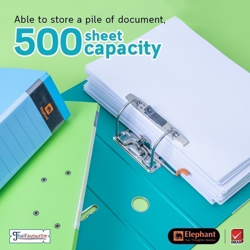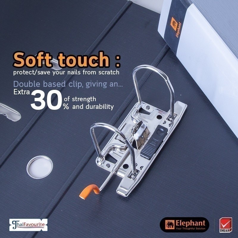 Elephant ตราช้าง แฟ้ม แฟ้มสันกว้าง ขนาดสัน 3 รุ่น 2100F/A4 - ปกผลิตจากกระดาษแข็ง หุ้ม Duraplast กันน้ำ และรอยขีดข่วน - มีกระเป๋าสำหรับใส่ป้ายชื่อใช้งานได้ 2 ด้าน - ป้ายใหม่ Extra Wide เปลี่ยนป้ายได้ง่ายขึ้น มีพื้นที่สำหรับเขียนเพิ่มขึ้น และจัดเรียงได้สวยงามมากขึ้น - คลิป Max Keep 550 ฐานคลิป 2