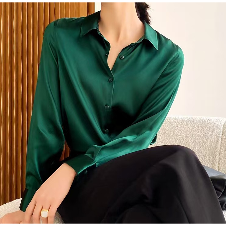 【ส่งจากไทย】เสื้อเชิ้ตแขนยาวผู้หญิง คอปกแฟชั่นผู้หญิง ผ้าซาตินสีพื้น office style เรียบๆ เนื้อผ้าลื่น