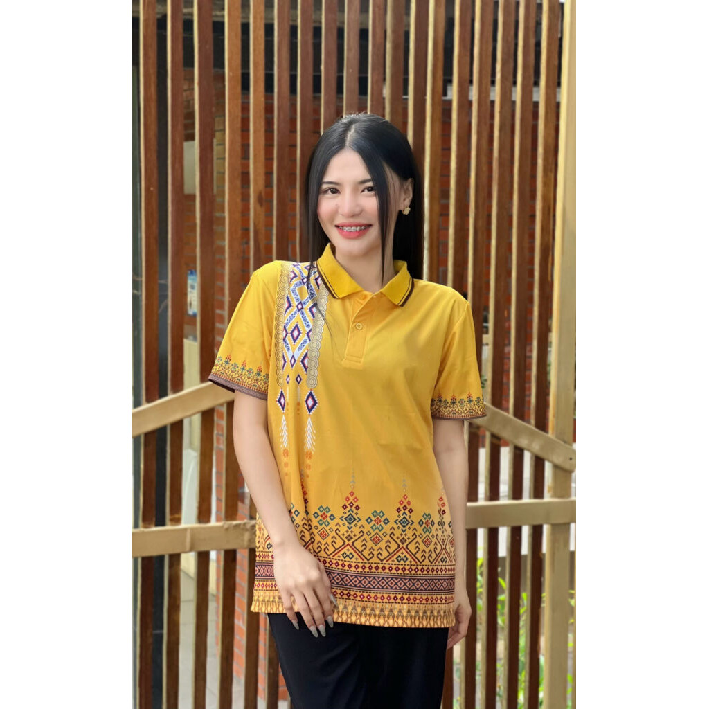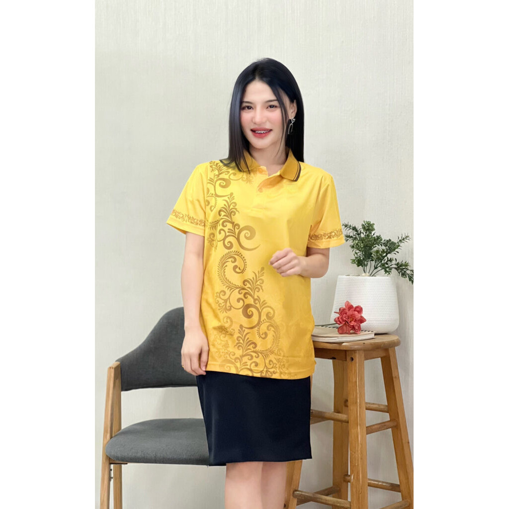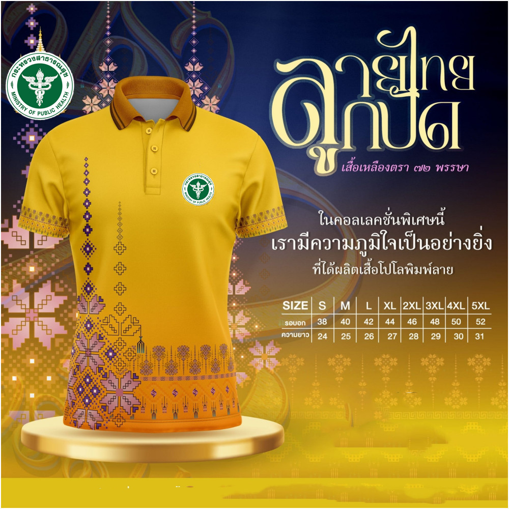 เสื้อโปโลสีเหลืองลายไทย บางและระบายอากาศได้ดี UNISEX (เลือกตราหน่วยงานได้ สาธารณสุข สพฐ อปท มหาดไทย อสม สำนักงานคณะกรรมการการศึกษาพื้นฐาน และอื่นๆ เลือกตราหน่วยงานได้)