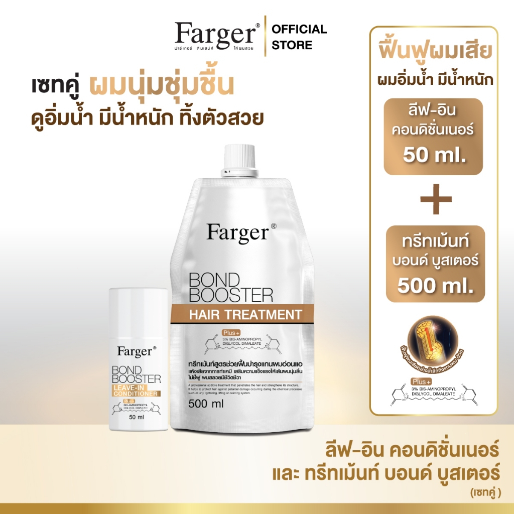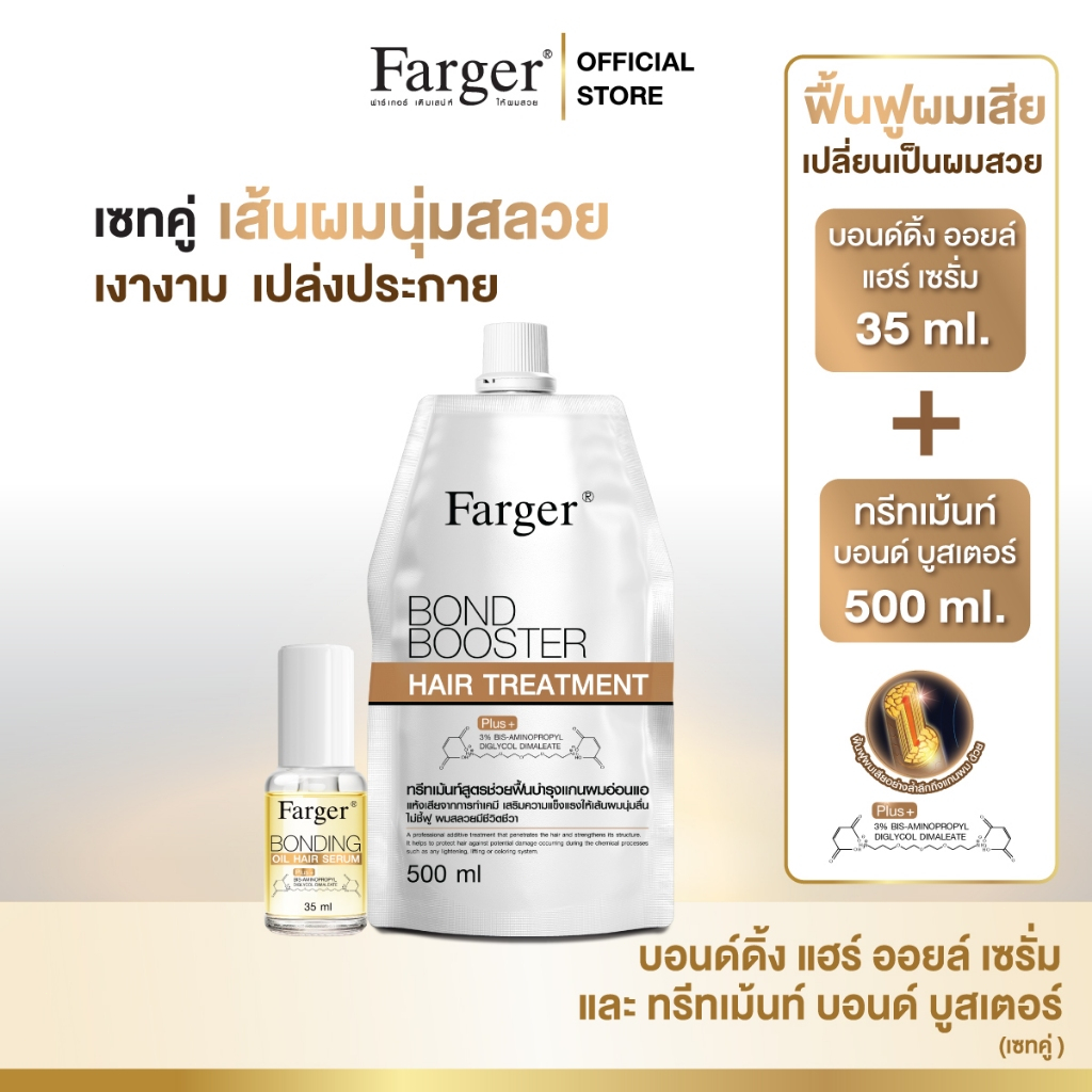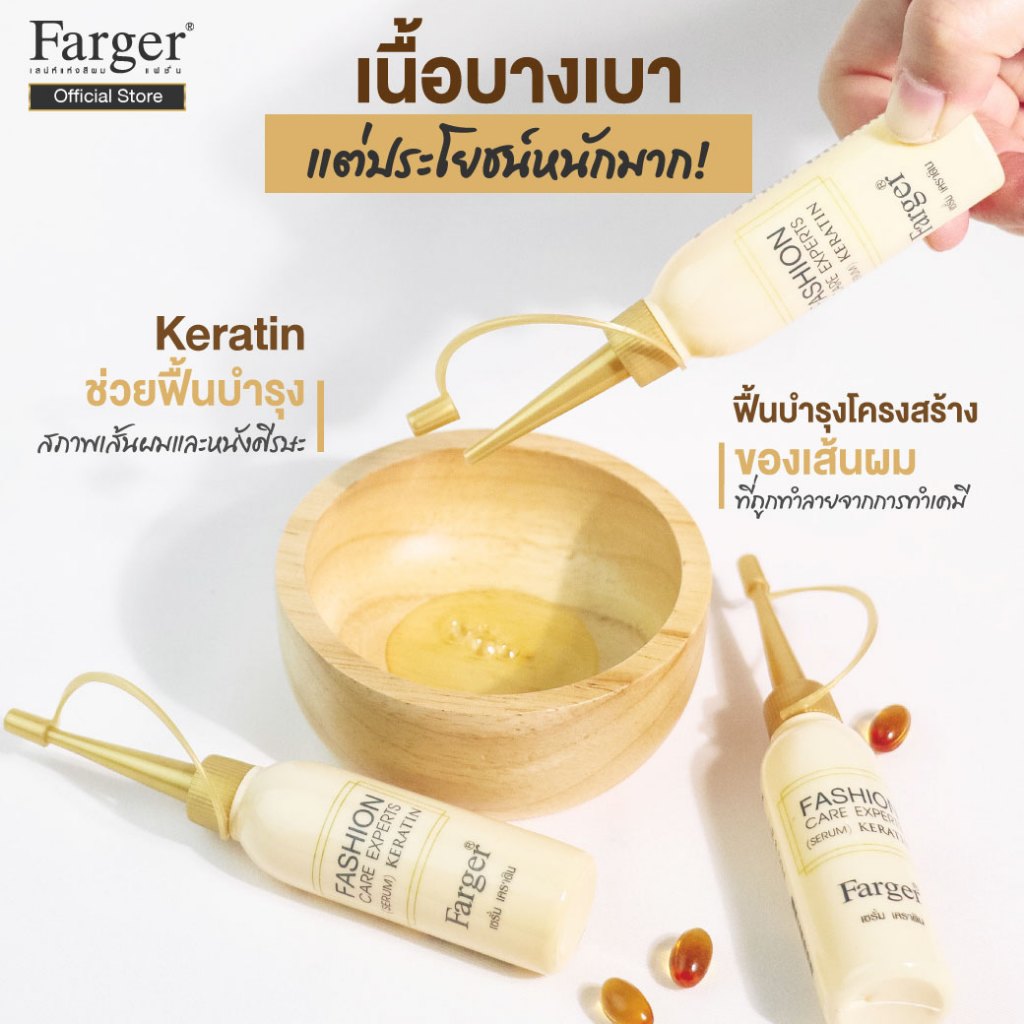 ... สมบูรณ์ให้กับเส้นผม เชื่อมบอนด์ และปกป้องเส้นผมระหว่างทำสารเคมี ฟอกผม ทำสี ดัดผม ยืดผม ยิ่งใช้ผมยิ่งสุขภาพดีขึ้นค่ะ ใช้ครั้งแรกจะรู้เลยว่าสภาพผมดีขึ้น! • Pro-Vitamin B5 ซึ่งเรียกอีกอย่างว่า Panthenol เป็นหนึ่งในส่วนผสมที่ดีที่สุดในผลิตภัณฑ์ดูแลเส้นผมและหนังศีรษะ ทำหน้าที่เป็นเกาะป้องกันการสูญเสียความชื้น ลดอาการคัน ดูแลปกป้องเส้นผม ซ่อมแซมเส้นผมที่ถูกกัดกร่อนโดยสารเคมีและความร้อน ช่วยเพิ่มปริมาณน้ำของเส้นผมและช่วยเพิ่มความยืดหยุ่นให้กับเส้นผม • Hydrolyzed Wheat Protein ระดับ Micro เป็นโปรตีนสกัดข้าวสาลี มีองค์ประกอบของกรดอะมิโนช่วยบำรุงผิวและเส้นผม ได้มาจากโปรตีนสกัดจากข้าวสาลีผ่านกระบวนการ Hydrolysis ทำให้มีโมเลกุลที่ขนาดเล็กมาก (Molecular weight : Low < 1,000 Dalton) มีโครงสร้างระดับไมโครโปรตีน สามารถแทรกซึมเข้าสู่เส้นผมและได้อย่างล้ำลึก ฟื้นบำรุงเส้นผมแข็งแรงขึ้น ไม่เปราะบางแตกหักง่าย • Shea Butter เชียร์บัตเตอร์ จากประเทศกาน่า ช่วยกักเก็บและเติมเต็มความชุ่มชื้นให้เส้นผม และช่วยบำรุงให้ผมนุ่มลื่น หลังจากใช้ Farger bond boster แล้วผมจะนุ่มลืน เป็นพิเศษ • (Argan Oil) น้ำมันอาร์แกนออยล์ ผลิตจากเม็ดของต้น โมร็อกกัน อาร์แกน ซึ่งเด่นในเรื่องของการเป็นสารอาหารผมเพราะว่ามีวิตามินอีมากกว่าในน้ำมันมะกอกถึง 3 เท่า จะเข้าไปช่วยซ่อมแซมปรับสภาพและฟื้นฟูเส้นผมที่ถูกทำลาย ช่วยให้เส้นผมนุ่มลื่น แข็งแรง เงางาม ช่วยเพิ่มความชุ่มชื่นให้กับเส้นผม และก็ยังมีสารต่อต้านอนุมูลอิสระ ช่วยฆ่าเชื้อแบคทีเรีย และขจัดสิ่งสกปรก และไม่ทำให้ผมมันด้วยค่า แชมพูเคราติน เหมาะสำหรับเส้นผมที่ผ่านการทำเคมี ช่วยฟื้นบำรุงสภาพเส้นผมที่แห้งเสีย ให้กลับมามีชีวิตชีวา อีกทั้งยังช่วยเคลือบปกป้องด้วย UV Active ทำให้สีผมติดทนนาน พร้อมมอบกลิ่นสัมผัสที่หอมชวนหลงใหลตั้งแต่โคนจรดปลายผม เพิ่มเสน่ห์ให้เส้นผมทุกครั้งหลังสระ วิธีใช้คู่กับแชมพูเคราติน 1. สระผมให้สะอาด ด้วยแชมพูเคราติน 2. เททรีทเม้นท์ลงบนเส้นผมแล้วหมักทิ้งไว้ 5-10 นาที 3. ล้างออกด้วยน้ำสะอาด และเป่าจัดทรงตามต้องการ ----------------------------------------------------------------------------------------------------------------------------------------------------------------------------------------------------------------------------------------- Farger Serum Keratin เซรั่มเคราตินจากพืช ช่วยฟื้นบำรุงสภาพเส้นผมและหนังศีรษะได้อย่างมืออาชีพ ช่วยฟื้นบำรุงโครงสร้างของเส้นผมที่ถูกทำลายจากการทำเคมีต่างๆ ให้กลับมามีสุขภาพดี เปล่งประกายเงางาม จนคุณสัมผัสได้ • ใช้เป็นประจำเพื่อสุขภาพผมที่แข็งแรง วิธีใช้ง่ายๆ เพียงแค่ เช็ดผมให้พอหมาด กด Farger เซรั่มเคราติน ในปริมาณที่พอเหมาะ ลูบเบาๆให้ทั่วเส้นผม ก่อนและหลัง