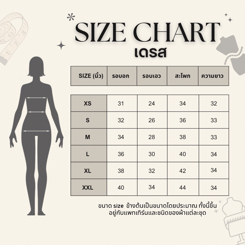 ... อก 40” เอว 34” สะโพก 44 “ ความยาวชุด XS : 32 นิ้ว S : 33 นิ้ว M : 33 นิ้ว L : 34 นิ้ว XL : 34 นิ้ว XXL : 34 นิ้ว