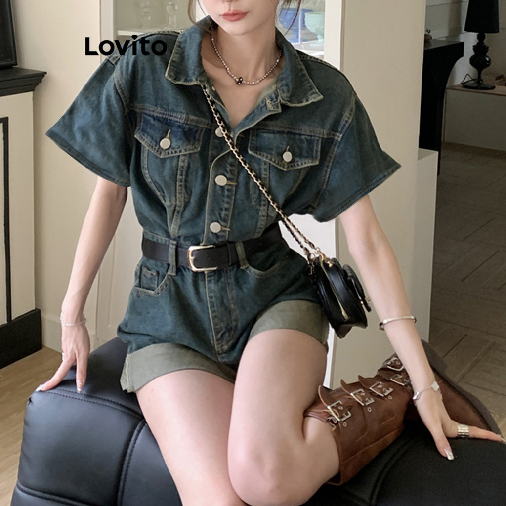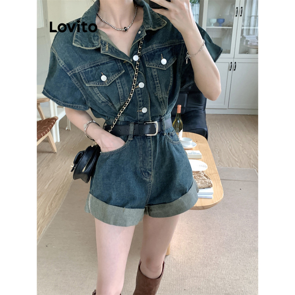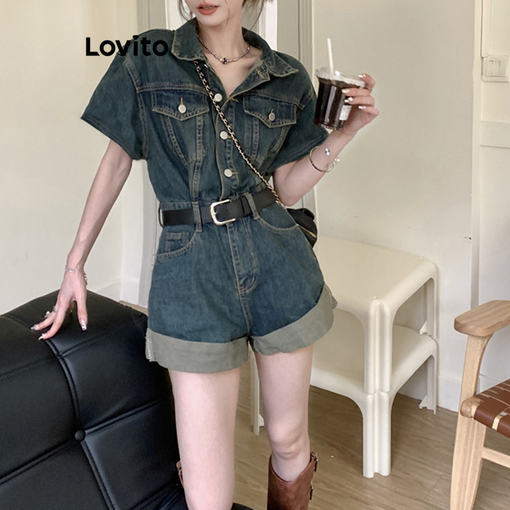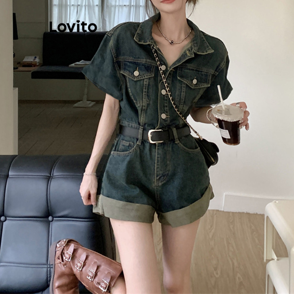 Lovito จั้มสูทผู้หญิง มีกระดุม แต่งกระเป๋า สีพื้น สไตล์ลำลอง LNE53258