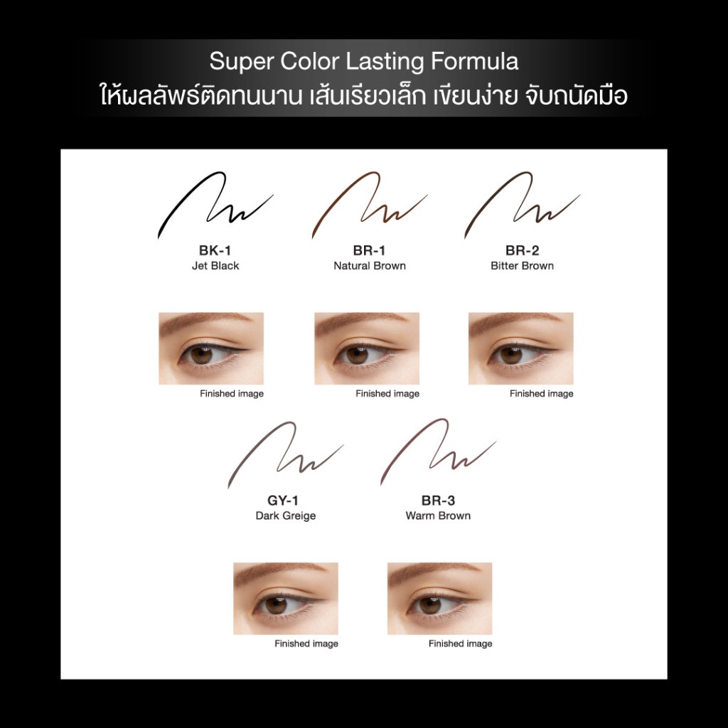 ... ยขึ้นเพียงใช้แรงกดที่ผิวเล็กน้อย ตัวแท่งออกแบบให้เหมาะกับปลายนิ้วพอดีเวลาถือ รูปทรงหกเหลี่ยมจับถัดมือ ทำให้วาดเส้นได้อย่างมั่นคง เพิ่มเฉดสีใหม่โทนดำและโทนน้ำตาล ขนแปรงแบบใหม่เฉพาะจาก KATE ผสมชนิดของเส้นขนแปรงเพิ่มความแน่น เพื่อการควบคุมการวาดเส้นอายไลเนอร์ ได้ง่ายกว่าเดิม เส้นขนแปรงมีความละเอียด บางเฉียบเป็นพิเศษให้สีชัดสม่ำเสมอ เขียนลื่น ไม่มีสะดุด - ขนแปรงพิเศษเขียนง่ายกว่าเดิม - สูตรกันน้ำ ทนต่อเหงื่อ น้ำ และน้ำตา - สีชัด ติดทนตลอดวัน - ล้างออกง่ายด้วยน้ำอุ่น - Smudge-proof formula ไม่เลอะเปื้อนระหว่างวัน ทนน้ำมันจากผิว และการเสียดสี ใหม่! 5 เฉดสี ให้เส้นคมสวย อย่างที่คุณต้องการ🖤 BK1 - Jet Black BR1 - Natural Brown BR2 - Bitter Brown GY1 - Dark Greige *วางขายเฉพาะช่องทางออนไลน์เท่านั้น BR3 - Warm Brown *วางขายเฉพาะช่องทางออนไลน์เท่านั้น
