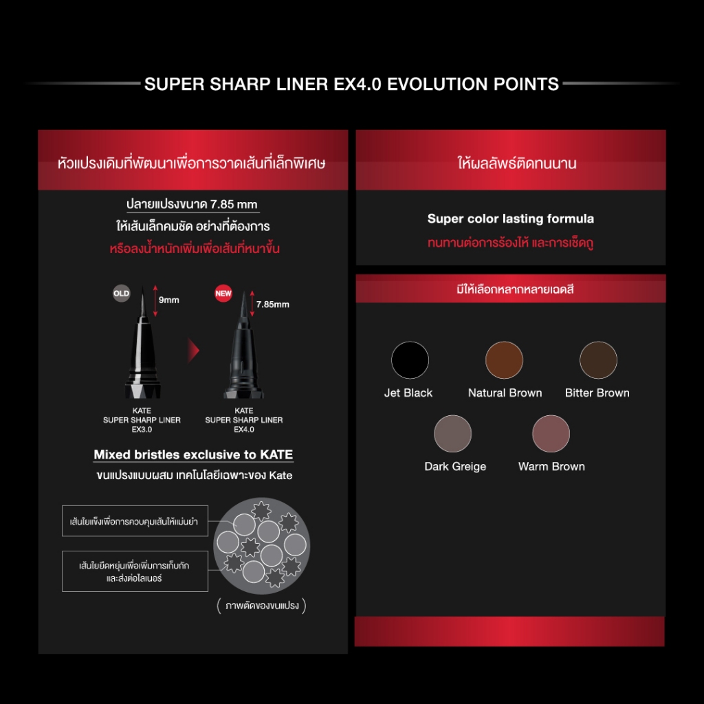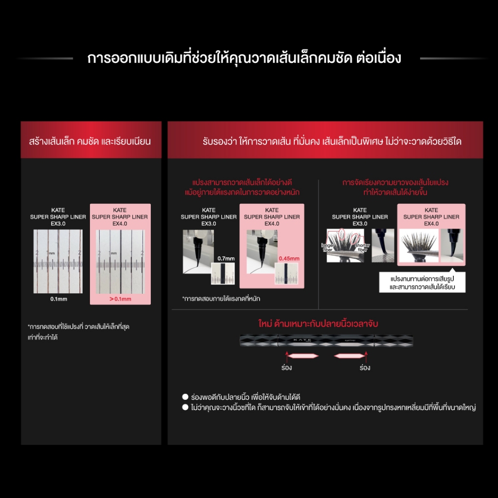 KATE SUPER SHARP LINER EX4.0 ใหม่! ให้คุณกรีดตาเป๊ะ ได้มากกว่าเดิม ปลายพู่กันปรับใหม่ สั้นลง คอนโทรลการกรีดตาได้ง่ายขึ้น เส้นเรียว คมชัด จับถนัด ให้การกรีดตาเป็นเรื่องง่ายกว่าเดิม หัวแปรงที่ถูกพัฒนาเพื่อการวาดเส้นได้ บาง คมชัด และเรียวเล็กอย่างง่ายดาย ปลายแปรงยาว 5.5 มม. ทำให้วาดเส้นหนาได้ง่า