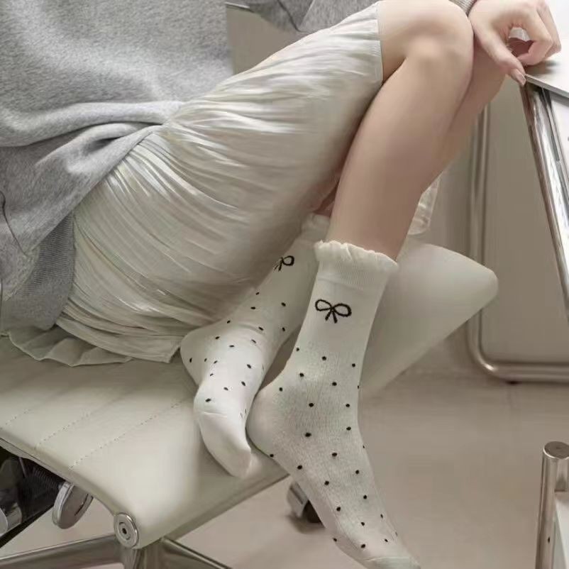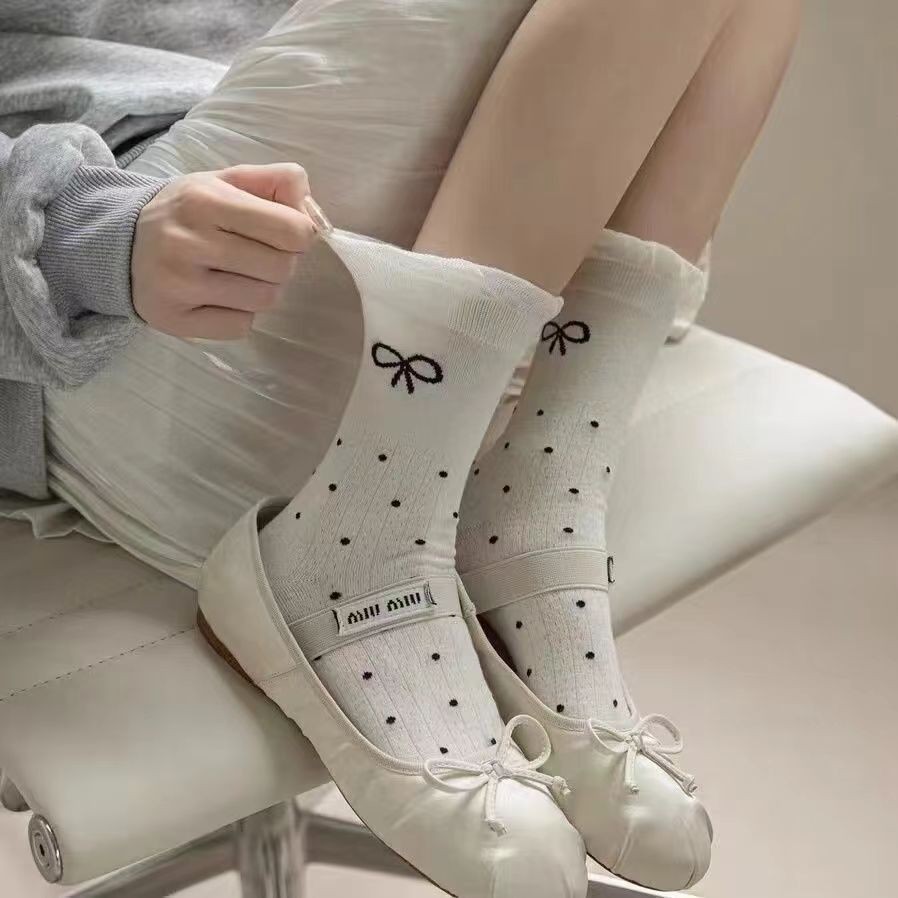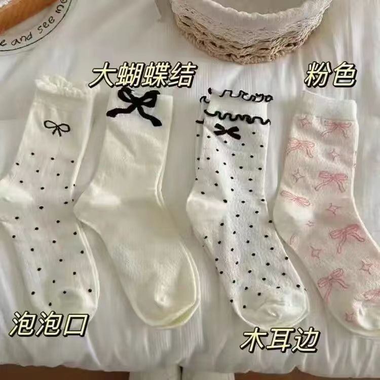 สไตล์บัลเล่ต์กลาง-หลอดถุงเท้าหญิงโลลิต้าฤดูใบไม้ผลิฤดูร้อนถุงเท้าผ้าฝ้ายตาข่ายบางสไตล์ดูดซับเหงื่อลูกไม้โบว์กองถุงเท้า