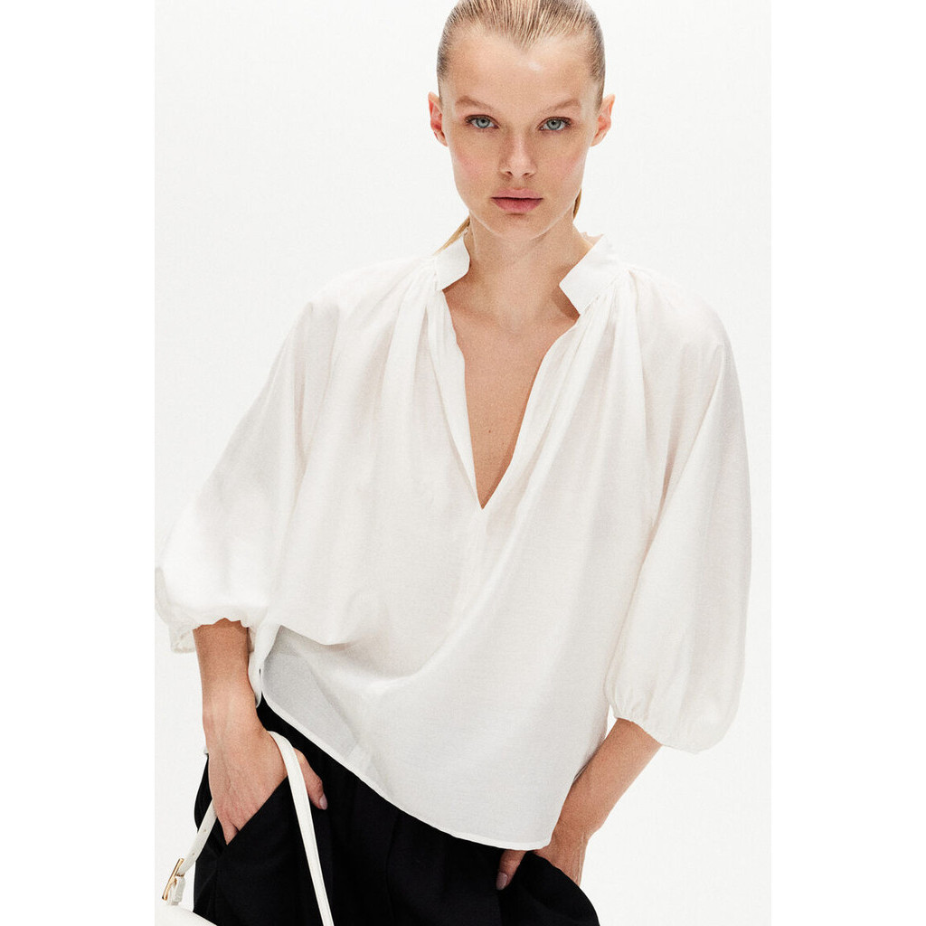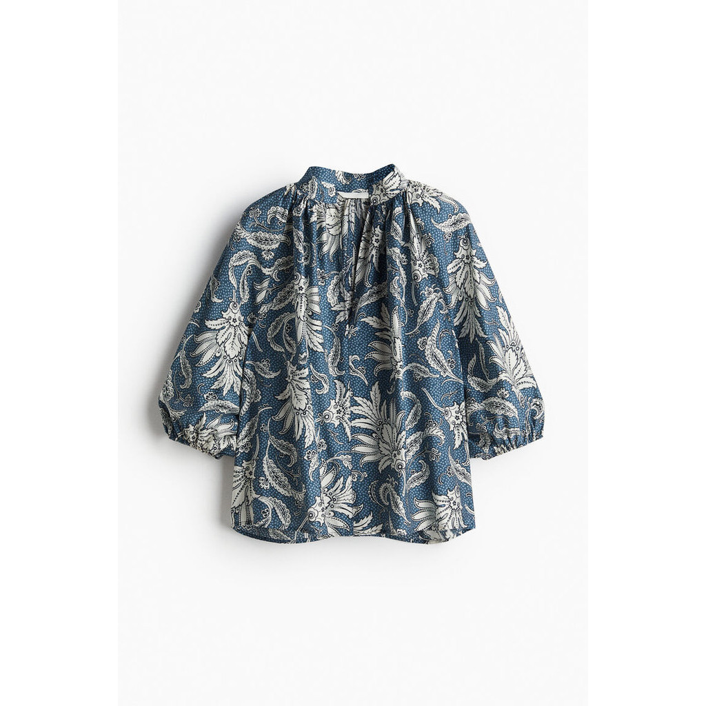 Loose-fit blouse in woven fabric featuring a stand-up collar with gathers, and a V-shaped opening at the front. 3/4-length balloon sleeves in a raglan cut with elasticated cuffs. Care Instruction : Can be dry cleaned,Machine wash at 30°,Medium iron,Only non-chlorine bleach when needed,Line dry