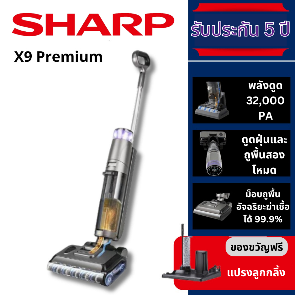 ... ry mop Vacuum (X9 PREMIUM)เครื่องดูดฝุ่นถูพื้นเปียกและแห้งไร้สาย ✅️แรงดูดทรงพลัง สูงถึง 12,000 PA ปรับโหมดแรงดูดได้ 2 ระดับ : Low Mode / High Mode ✅️ประหยัดเวลา ไม่เปลืองแรง การันตีความสะอาด ปราศจากฝุ่นและคราบสกปรกอย่างแน่นอน ✅️มาพร้อมฟังก์ชั่น Self Cleaning กดปุ่มเดียวล้างทำความสะอาดตัวเครื่องได้เองเสร็จสรรพ ✅️ไม่ต้อออกแรงให้เหนื่อยด้วย Self Driving System ช่วยในการขับเคลื่อนไปด้านหน้า แค่ประคองเครื่องไปในทิศทางที่ต้องการ ประหยัดแรงได้อีกเยอะ ✅️ดูดฝุ่น – ล้าง – ขัดถู ไปพร้อมๆกัน ไม่ว่าจะฝุ่นละออง เศษอาหาร คราบสกปรก ก็ทำความสะอาดได้ในขั้นตอนเดียว ✅️แท๊งค์น้ำดีความจุ 600ml. แท๊งค์น้ำเสียความจุ 650ml. ✅️Micro Fiber Rolling Brush ม๊อบถูพื้นทรงแยมโรล สำหรับดูดซับของแหลวและสิ่งสกปรกออกจากพื้น จะหมุนด้วยความเร็วถึง 70,000 rpm. ช่วยเพิ่มประสิทธิภาพให้สะอาดหมดจดยิ่งกว่าเดิม ✅️Digital Display หน้าจอดิจิตอล คอยบอกสถานะ ขณะเครื่องกำลังทำงาน ✅️Li-Ion Battery 4,000 mAh ใช้งานได้นานจุใจ ✅️Charging Base มีแท่นชาร์จที่ทำให้สามารถจัดเก็บตัวเครื่องและอุปกรณ์อื่นๆ ได้อย่างเป็นระเบียบเรียบร้อย หลังจากใช้งานเสร็จแล้วเพียงวางกลับเข้าแท่นชาร์จ และเสียบสายชาร์จก็เป็นอันเสร็จสิ้นขั้นตอนการชาร์จแบตเตอรี่ ✅️Hepa Filter กรองฝุ่นได้ละเอียดแม้ไรฝุ่นก็ไม่เล็ดลอด ✅️รับประกันมอเตอร์ 2 ปี (ตัวเครื่อง 1ปี) 📣 Self Cleaning System ฟังก์ชั่นล้างทำความสะอาดตัวเครื่องอัตโนมัติ เพียงกดปุ่ม Self-Cleaning ค้าไว้ 3 วินาที เครื่องก็จะเข้าสู่โหมดล้างทำความสะอาดตัวเอง โดยการฉีดน้ำล้างแปรงและช่องดูดสิ่งสกปรก จากนั้นจะเพิ่มความเร็วในการหมุนหัวแปรง เพื่อปั่นให้หัวแปรงและผ้าถูแห้งหมาด 📣 Self Driving System ระบบแรงขับเคลื่อนไปด้านหน้า ที่จะช่วยให้เราไม่ต้องแบกรับน้ำหนักของตัวเครื่อง เพียงแค่เราประคองที่ด้ามจับแล้วบังคับไปในทิศทางที่ต้องการทำความสะอาด ออกแบบมาเพื่อรองรับการใช้งานให้ครอบคลุมสำหรับทุกเพศ ทุกวัย
