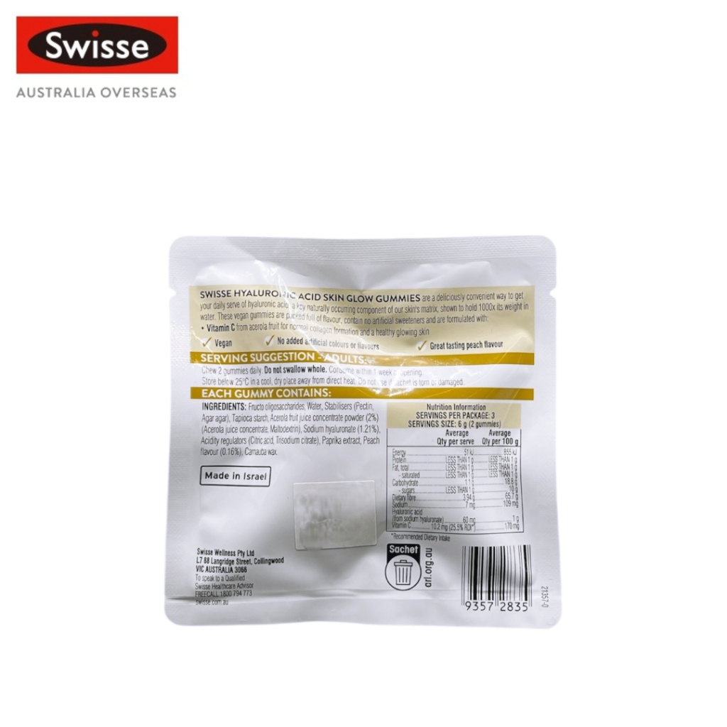 ... tion. The delicious peach flavour makes them an absolute pleasure to eat, all with no artificial sweeteners. Each gummy contains 1.21% sodium hyaluronate, providing convenience to your beauty routine. Benefits Formulated with Vitamin C from acerola fruit for normal collagen formation Vegan friendly Delicious peach flavour No artificial sweeteners Directions + Warnings Serving Suggestion - Adults: Chew 2 gummies daily as directed by a healthcare professional. Do not swallow whole. Storage: Store below 25°C in a cool, dry place away from direct heat. Do not use if inner seal is missing or broken. Allergen Information No added artificial sweeteners, colours of flavours. Suitable for vegans. Ingredients Fructo oligosaccharides Water Stabilisers (Pectin, Agar agar) Tapioca starch Acerola fruit juice concentrate powder (2%) (Acerola juice concentrate, Maltodextrin) Sodium hyaluronate (1.21%) Acidity regulators (Citric acid, Trisodium citrate) Paprika extract Peach flavour (0.16%) Carnauba wax FAQS Is this product suitable for use during pregnancy and breastfeeding? We suggest that you consult your Primary Healthcare Professional when considering changes to your supplementary routine, particularly during pregnancy and breastfeeding, as they can best advise on what’s right for your individual needs. Does this product contain any artificial sweeteners? No. This product does not contain any artificial sweeteners.