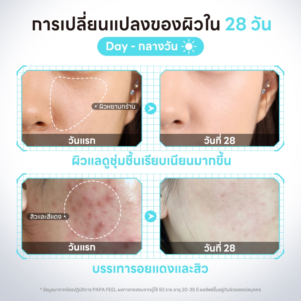 ... AP, Ceramide EOP Soluble Collagen Centella Asiatica Hyaluronic Acid ขั้นตอนการใช้งาน 1.ทำความสะอาดผิวหน้า 2.ใช้โทนเนอร์และเอสเซ้นส์ 3.ทาครีมให้ความชุ่มชื้นให้ทั่วผิวหน้า 4.นวดเบาๆ PAPA FEEL 3X RETINOL Ceramide Soluble Collagen ครีมทาหน้า น้ำหนักสุทธิ:30g ส่วนผสมที่สำคัญ: 3 kinds of Retinol Soluble Collagen Vitamin E Ceramide NP ขั้นตอนการใช้งาน 1.ทำความสะอาดผิวหน้า 2.ใช้โทนเนอร์และเอสเซ้นส์ 3.ทาครีมให้ความชุ่มชื้นให้ทั่วผิวหน้า 4.นวดเบาๆ PAPA FEEL 577 Serum เซรั่ม เพิ่มความชุ่มชื้นให้กับผิว น้ำหนักสุทธิ:30ml ส่วนผสมที่สำคัญ: 577[4-BUTYLRESORCINOL] ALPHA-ARBUTIN, NIACINAMIDE, VC[3-o-ETHYL ASCORBIC ACID] RETINYL PALMITATE, VITAMIN E[TOCOPHEROL] HYDROLYZED SODIUM HYALURONATE SODIUM HYALURONATE ขั้นตอนการใช้งาน 1.ทำความสะอาดผิวหน้า 2.ใช้ผลิตภัณฑ์ในปริมาณที่เหมาะสม 3.ทาเบาๆ ให้ทั่วใบหน้าและลำคอ 4.นวดเบาๆ