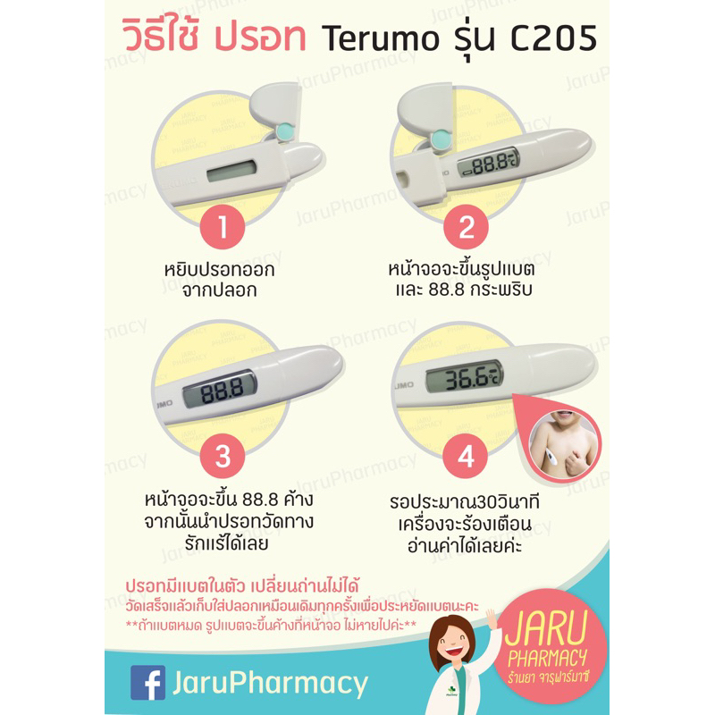 🤒ปรอทวัดไข้ดิจิตอล terumo รุ่น C205 ใช้วัดทางใต้รักแร้ คุณสมบัติ ✅ความแม่นยำสูง +/-0.1 องศาเซลเซียส ✅ใช้เวลาวัดเพียง 30 วินาที ✅แบตในตัวใช้ได้ 10,000 ครั้ง โดยประมาณ(เปลี่ยนแบตไม่ได้นะคะ) ✅กันน้ำ สามารถล้างทำความสะอาดได้ 🏥📍ส่วนใหญ่ตามโรงพยาบาลใหญ่ๆใช้ตัวนี้ ใช้งานง่าย อ่านผลไว วัดค่าได้แ