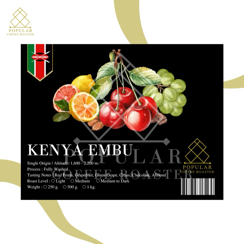 Popular coffee roaster เมล็ดกาแฟคั่ว Kenya Embu 🇰🇪 Single Origin / Altitude: 1,600 - 2,200 m. Process : Fully Washed Tasting Notes : Red Fruits, Grapefruit, Green Grape, Citrus, Chocolate, Almond Roast Level : ○ Light ○ Medium ○ Medium to Dark Weight : ○ 250 g. ○ 500 g. ○ 1