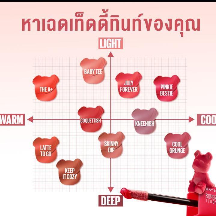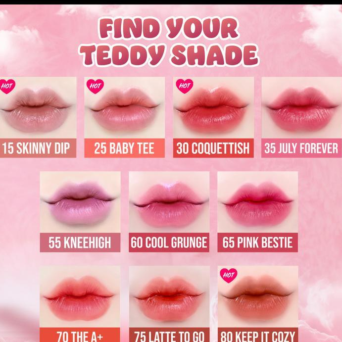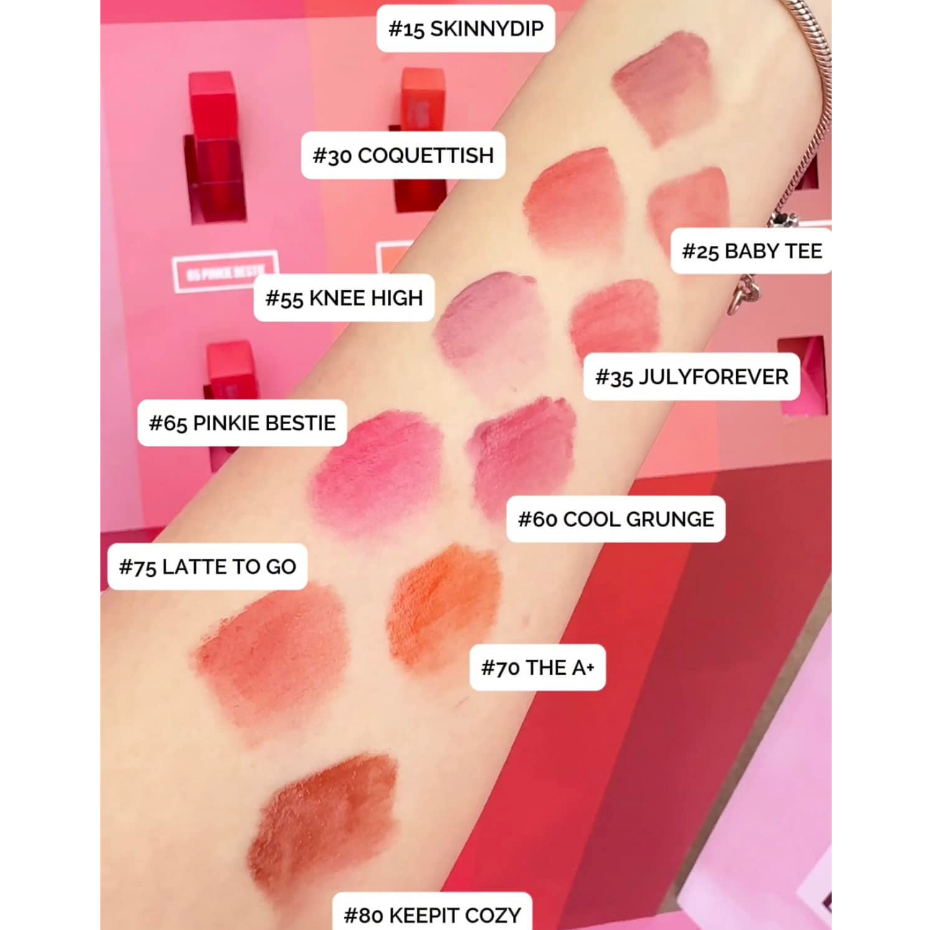 ... บปากคล้ำได้สนิท มาพร้อมเท็ดดี้เทคโนโลยีที่มี เบาวน์ซี่โพลีเมอร์ช่วยให้เนื้อลิปมีสัมผัสบางเบาและนุ่ม และคัลเลอร์ฮักกิ้ง เฟล็กซี่ฟิล์มช่วยให้ลิปติดทนยาวนาน 12ชม โดยไม่ทรานส์เฟอร์ เฉดสีได้แรงบันดาลใจจากนิวยอร์ก 10 เฉดสีใหม่ บิลด์สีได้ เบลนด์สีได้ ทาได้ทั้งแก้มและปาก คิ้วท์เลย" มี 10 สีให้เลือก 15 SKINNY DIP 25 BABY TEE 80 KEEP IT COZY 30 COQUETTISH 70 THE A+ 75 LATTE TO GO 35 JULY FOREVER 55 KNEEHIGH 60 COOL GRUNGE 65 PINKIE BESTIE