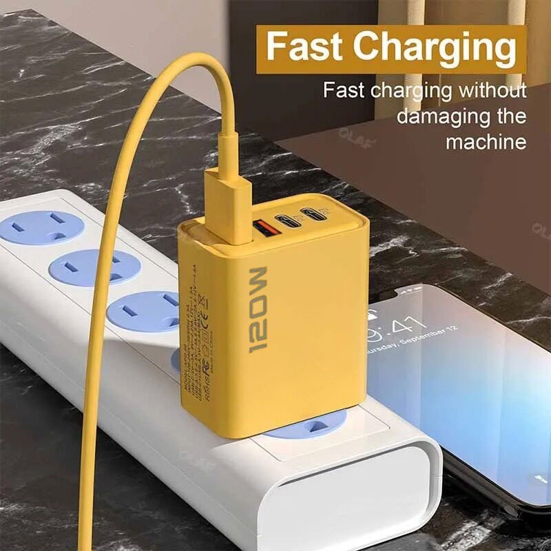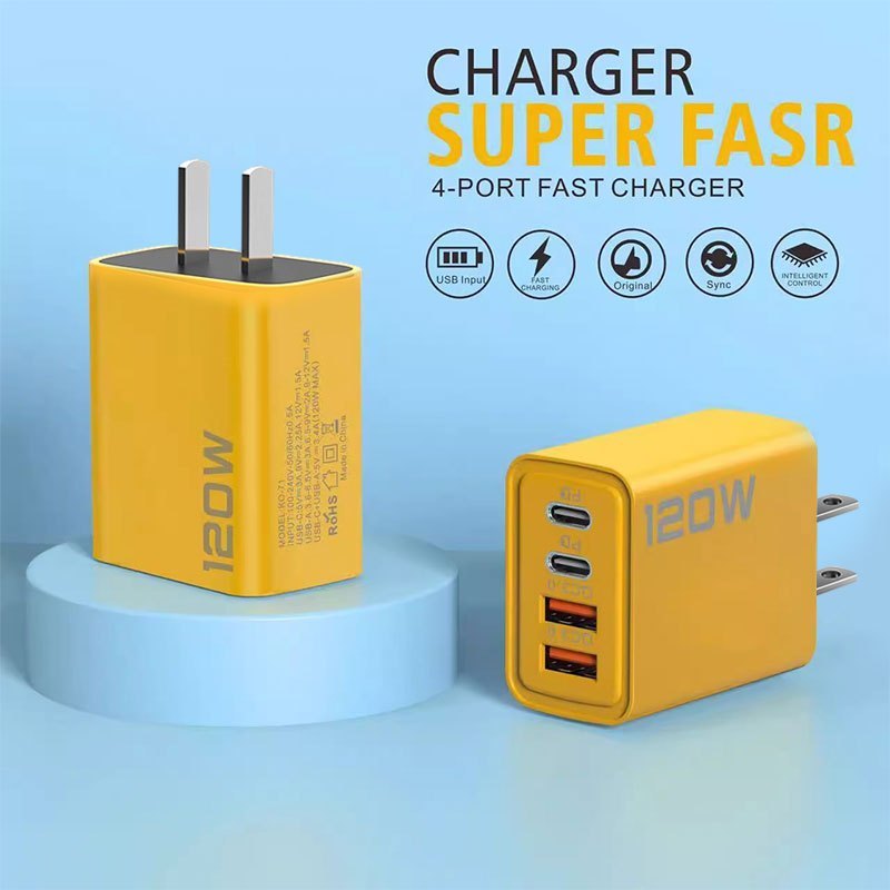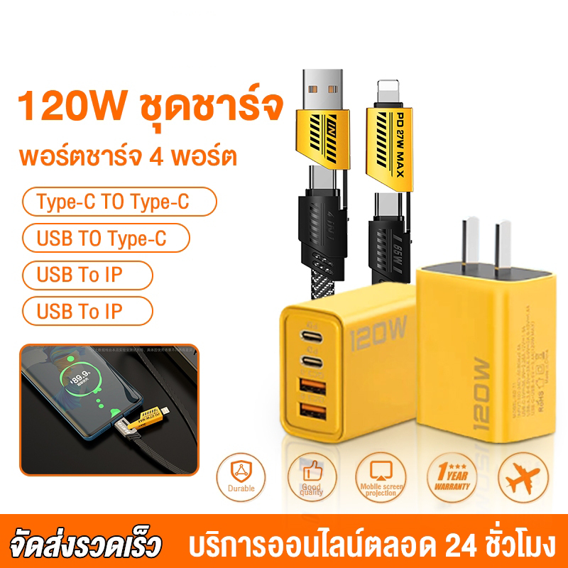 อะแดปเตอร์ชาร์จเร็ว 120W ชาร์จเร็วสุด QC 3.0 หัวชาร์จ สายชาร์จเมชาสีเหลือง4in1 สําหรับ iP 15 14 13 12 11 Micro TYPE-C