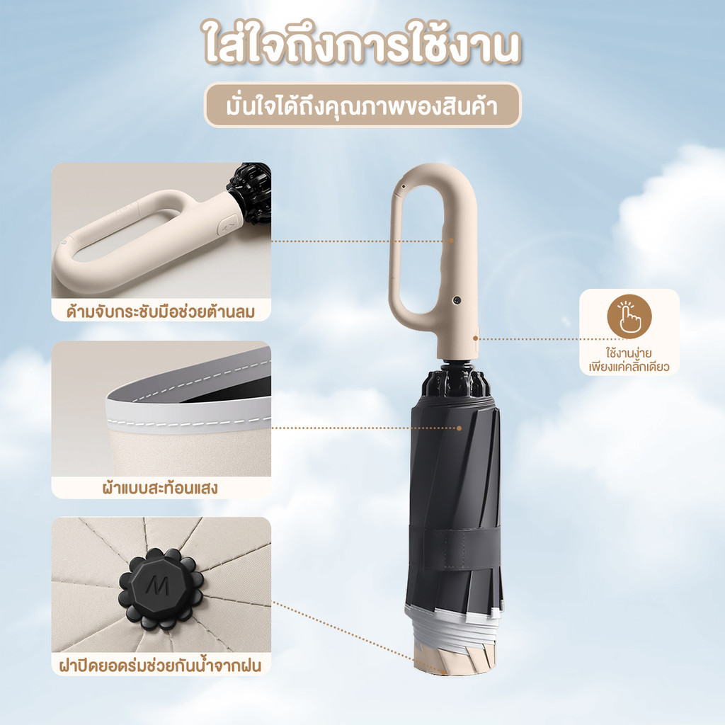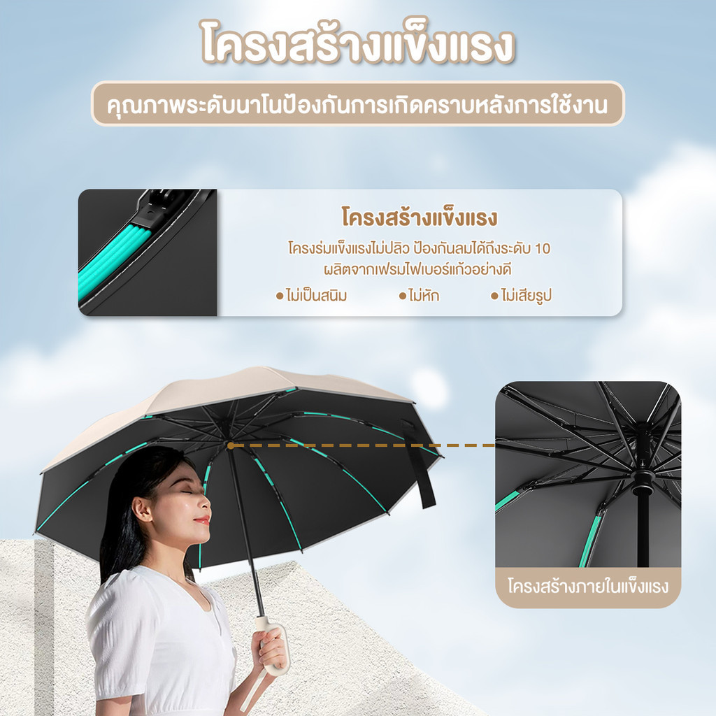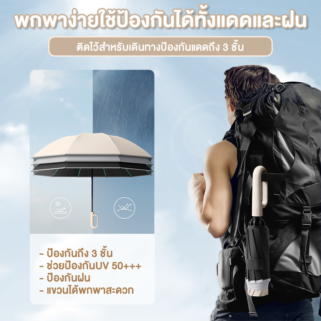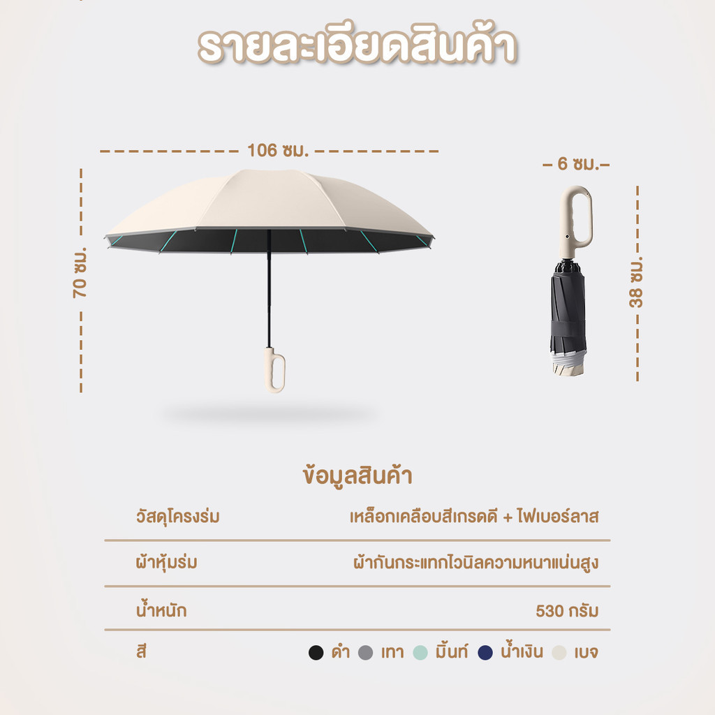 ... ระเด็นเปียกตามตัว เปียกตามพื้น ☂ ผลิตจากเฟรมไฟเบอร์แก้วอย่างดี มั่นคง แข็งแรง ทนทาน ต้านทางแรงลมได้ดีเยี่ยมป้องกันลมได้ถึงระดับ 10 ☂ ป้องกันถึง 3 ชั้น ช่วยป้องกันUV 50++ ร่มกันแดดได้ถึง 99% รู้สึกเย็นทันที่เมื่ออยู่ใต้ร่ม ไม่ต้องกลัวผิวเสีย ☂ ผ้าผลิตจากผ้านาโน มีคุณสมบัติกันน้ำได้ดี น้ำหนักเบา ความหนาแน่นสูง ไม่อุ้มน้ำ แห้งเร็ว สะบัดออกง่าย ☂ ขอบร่มเย็บผ้าสะท้อนกับแสงปลอดภัยสำหรับการเดินทางในคืนฝนตก ☂ร่มพับ 3 ตอน ที่จับสไตล์ห่วงสามารถแขวนได้ มีน้ำหนักพอสมควร พกพาสะดวก วิธีการใช้งาน ☔ 1⃣ร่มอัตโนมัติ กดปุ่ม 1ครั้ง ร่มจะกางออก 2⃣หลังใช้งาน กดปุ่มอีก 1ครั้ง ร่มจะหุบลง แต่ตัวก้านร่ม ลูกค้าจะต้องทำการดันลงมา ให้เข้าล็อก