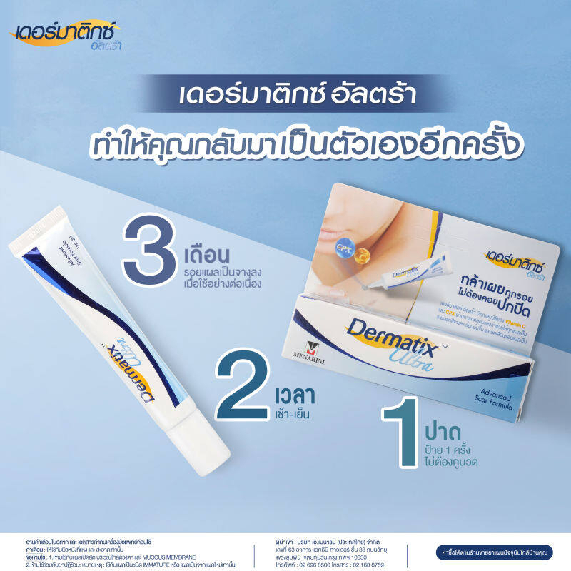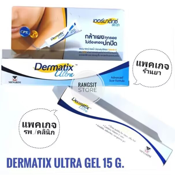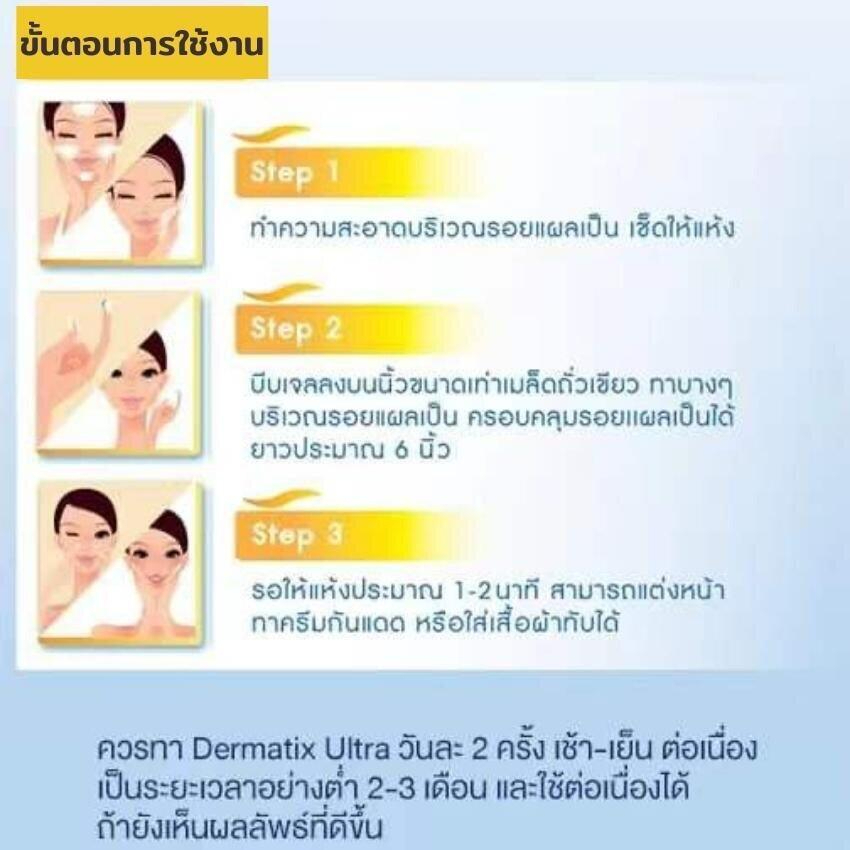 Dermatix Ultra Gel เดอร์มาติกซ์ อัลตร้า เจล ขนาด 15 กรัม ใช้เพียง 1 เมล็ดถั่วเขียว เหมาะสำหรับแผลเป็นขนาด 10-15 ซม. สามารใช้ทาบริเวณใบหน้าได้ แต่ใช้ทาตอนแผลแห้งเท่านั้น ขนาด 15 กรัม