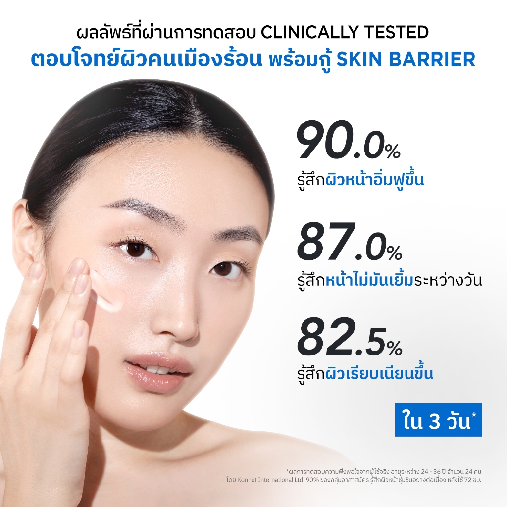 ... oin Hydro Complex ทำให้ผิวชุ่มชื้นอย่างล้ำลึก ปลอบประโลมและปกป้องผิวจากมลภาวะต่างๆ เพื่อผิวแข็งแรง ดูสุขภาพดี • 5X Ceramide รวมคุณประโยชน์ของเซราไมด์ 5 ชนิด ด้วยเทคโนโลยี MLD (Multi-Lamellar Delivery System) ใกล้เคียงโครง สร้างผิวตามธรรมชาติ ช่วยฟื้นบำรุงปราการผิวให้แข็งแรง เพื่อผิวชุ่มชื้นดูเรียบเนียนน่าสัมผัส • Niacinamide 3% ช่วยลดเลือนจุดด่างดำ รอยดำ รอยแดง ปรับสีผิวให้ดูสม่ำเสมอ เพื่อผิวเปลั่งปลั่ง สีผิวดูเรียบเนียน ไร้จุดด่างดำ • 8 HYA ด้วยไฮยาลูรอน 8 ชนิดที่มีขนาดโมเลกุลแตกต่างกัน ซึมเข้าบำรุงและมอบความชุ่มชื้นได้ทุกชั้นผิว ลดการสูญเสียและกักเก็บความชุ่มชื้น พร้อมเสริมสร้างเกราะป้องกันผิวให้แข็งแรง ปราศจากน้ำหอม, แอลกอฮอล์, พาราเบน, ซิลิโคน และน้ำมันแร่ ผ่านการทดสอบการระคายเคืองกับผิวบอบบางแพ้ง่ายภายใต้การควบคุมของแพทย์ผิวหนัง โดย Dermscan Asia วิธีการใช้: ใช้บำรุงผิวหน้าและลำคอ โดยทาผลิตภัณฑ์ให้ทั่วบริเวณที่ต้องการเป็นประจำเช้า-เย็น หรือบ่อยครั้งตามที่ต้องการ All Ingredients: Water, Niacinamide, Butylene Glycol, Isononyl Isononanoate, Betaine, Glycerin, Dipropylene Glycol, Hydroxyacetophenone, Sodium Polyacrylate, Sodium Acrylate/Sodium Acryloyldimethyl Taurate Copolymer, Carbomer, Ectoin, Isohexadecane, Caprylyl Glycol, Potassium Hydroxide, Panthenol, Disodium EDTA, Polysorbate 80, Sorbitan Oleate, Aloe Barbadensis Leaf Juice Powder, Tocopheryl Acetate, Dipotassium Glycyrrhizate, Oenothera Biennis (Evening Primrose) Oil, Squalane, Acetyl Glucosamine, Broussonetia Kazinoki Root Extract, Ceteareth-25, Hydrolyzed Algin, Sorbitol, 1,2-Hexanediol, Camellia Japonica Leaf Extract, Camellia Sinensis Leaf Extract, Centella Asiatica Extract, Morus Alba Bark Extract, Phenoxyethanol, Pyrus Malus (Apple) Fruit Extract, Cetyl Alcohol, Laminaria Digitata Extract, Lecithin, Xanthan Gum, Ascorbyl Palmitate, Behenic Acid, Caprooyl Phytosphingosine, Caprooyl Sphingosine, Ceramide AP, Ceramide EOP, Ceramide EOS, Ceramide NP, Ceramide NS, Cholesterol, Chondrus Crispus (Carrageenan) Extract, Citric Acid, Diatomaceous Earth, Ethylhexylglycerin, Galactoarabinan, Glucose, Glyceryl Caprylate, Glyceryl Oleate, Glyceryl Stearate, Hyaluronic Acid, Hydrolyzed Hyaluronic Acid, Hydrolyzed Sodium Hyaluronate, Hydroxypropyltrimonium Hyaluronate, Potassium Hyaluronate, Sodium Acetylated Hyaluronate, Sodium Hyaluronate, Sodium Hyaluronate Crosspolymer, Tocopherol, Tricholoma Matsutake Extract, Zinc Sulfate.