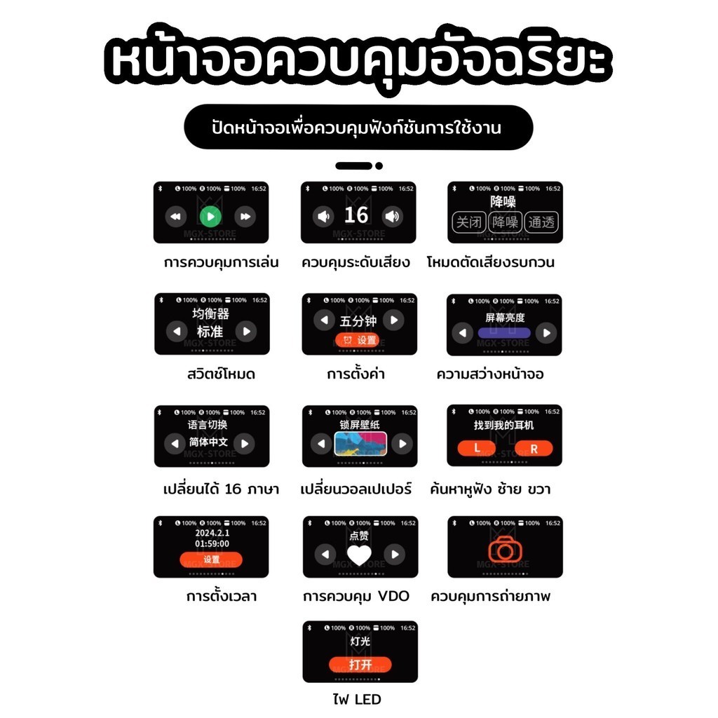 ... งาน 1.แตะที่หูฟัง 1 ครั้ง เพื่อ เปิด/ปิด เพลง 2.แตะที่หูฟัง 2 ครั้ง เพื่อ เล่นเพลงถัดไป 3.แตะที่หูฟัง 3 ครั้ง เพื่อ เล่นเพลงก่อนหน้า 4.สไลด์ขึ้น/ลง เพื่อเพิ่มเสียง/ลดเสียง 5.กดค้าง 2 วิ เพื่อเปิดฟั่งชั่น siri 6.เปิด/ปิดฝา เพื่อ เปิด/ปิดหูฟัง 7.เชื่อมต่อผ่านบลูทูธ เลิอก บลูทูธชื่อ A9Pro เพื่อเชื่อมต่อกับหูฟัง กล่องชาร์จหน้าจอ LED แบบสัมผัส แสดงสถานะฟังก์ชั่นการใช้งานของกล่องชาร์จและหูฟัง ควบคุมการใช้งานหูฟังได้ง่าย โดยควบคุมผ่านหน้าจอ LED แบบสัมผัสที่กล่องชาร์จ ฟังก์ชั่นการใช้งานผ่านกล่องชาร์จ 13 ฟังก์ชั่น หูฟังเบสหนัก เบสแน่น ลดเสียงรบกวนรอบข้างได้ดี ใส่ออกกำลังกายได้ กันน้ำ กันเหงื่อได้ดี มีฟังก์ชั่นเปลี่ยนเข้าสู่โหมดเกมส์