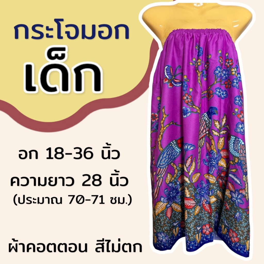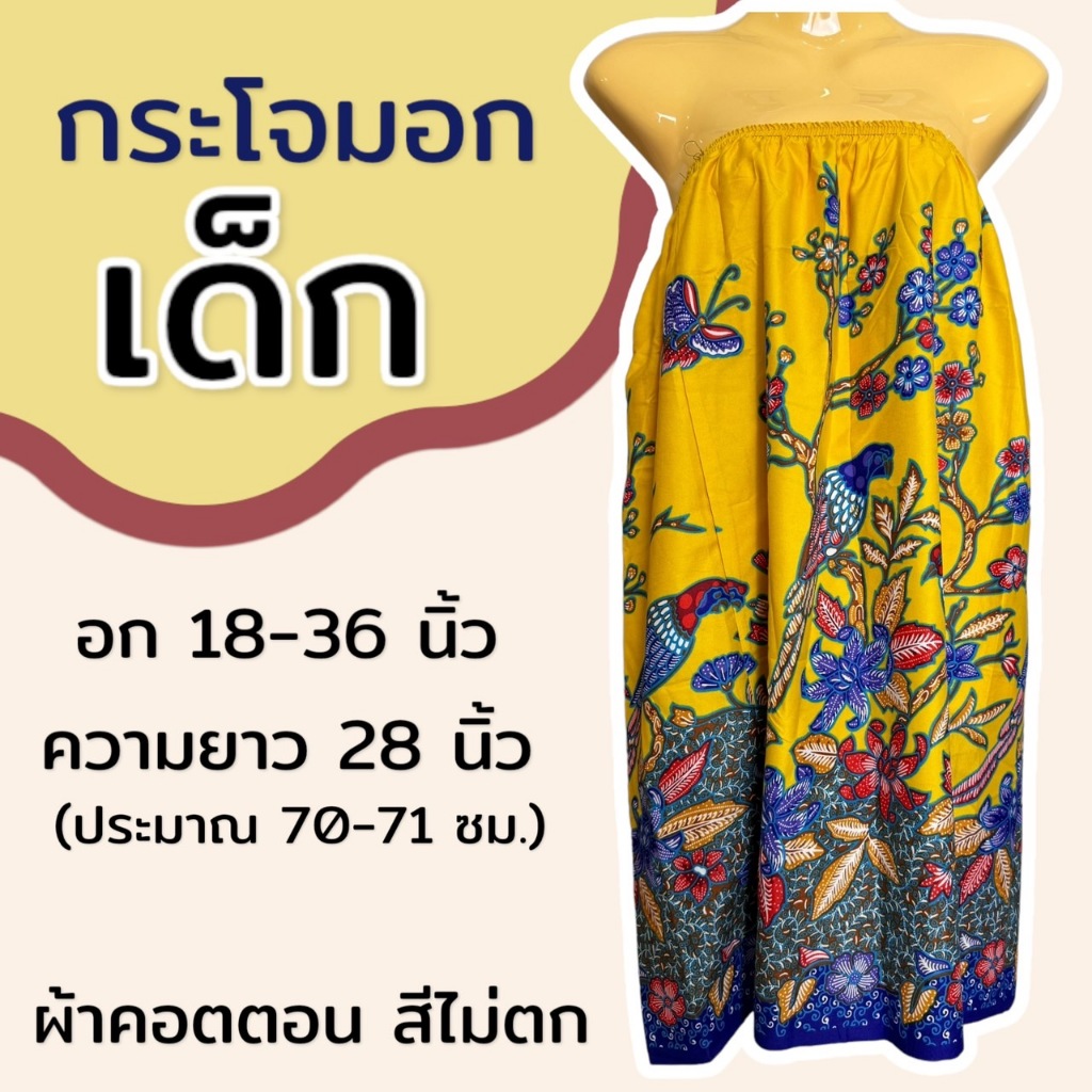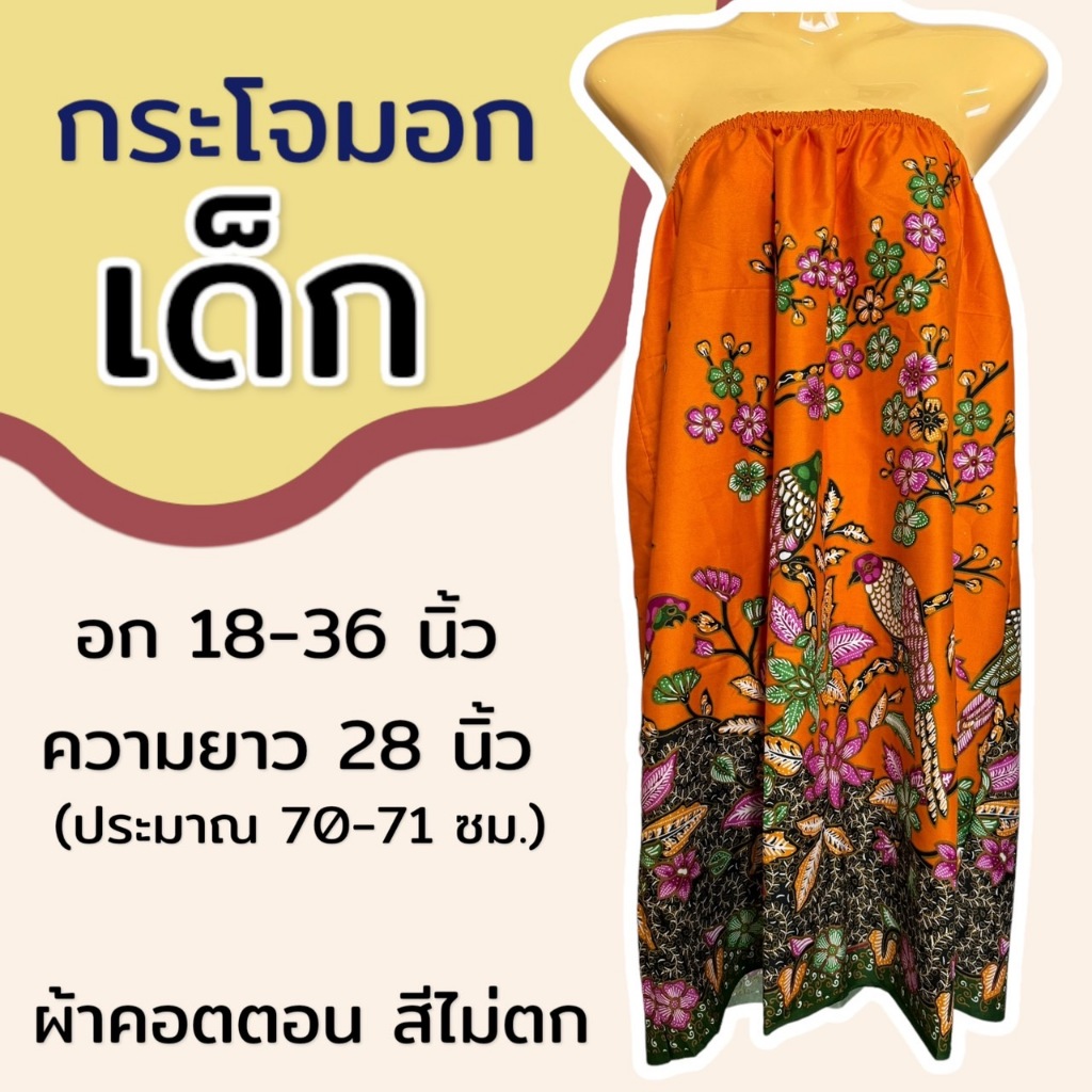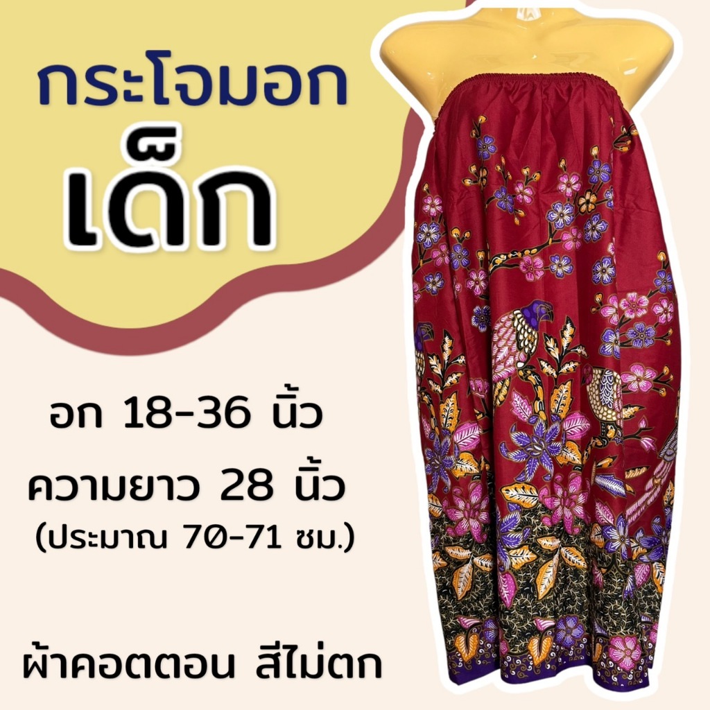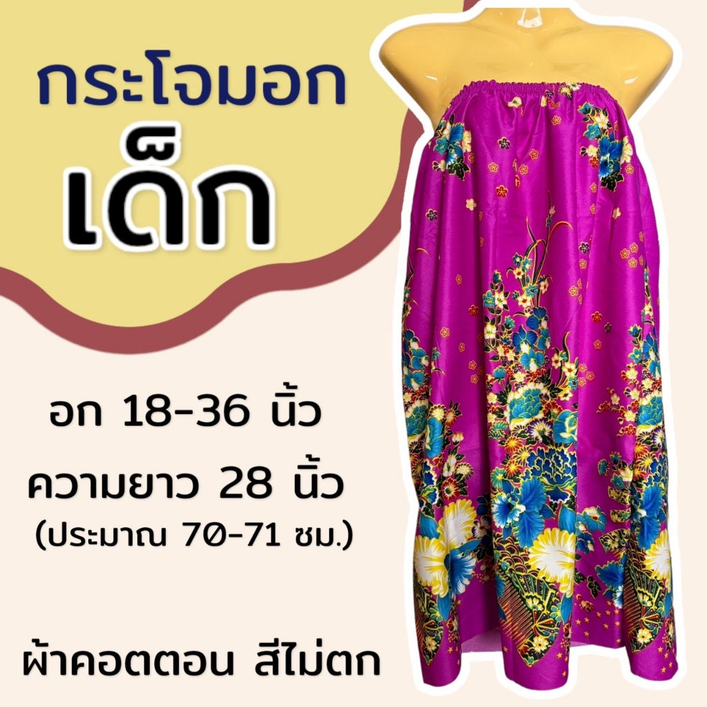 กระโจมอกเด็ก ความยาว 70 ซม. สำหรับเด็กโต ผ้าถุงเอวยางยืด ผ้าถุงอาบน้ำ - ผ้าคอตตอน ผ้านิ่ทม ใส่สบาย ไม่หดน้ำ สีไม่ตก - ใช้ยางยืดคุณภาพดี ไม่รัดหน้าอก ขนาดกระโจมอกเด็ก รอบอก 18-36 นิ้ว ความยาว 28 นิ้ว (ประมาณ 70-71 ซม.)