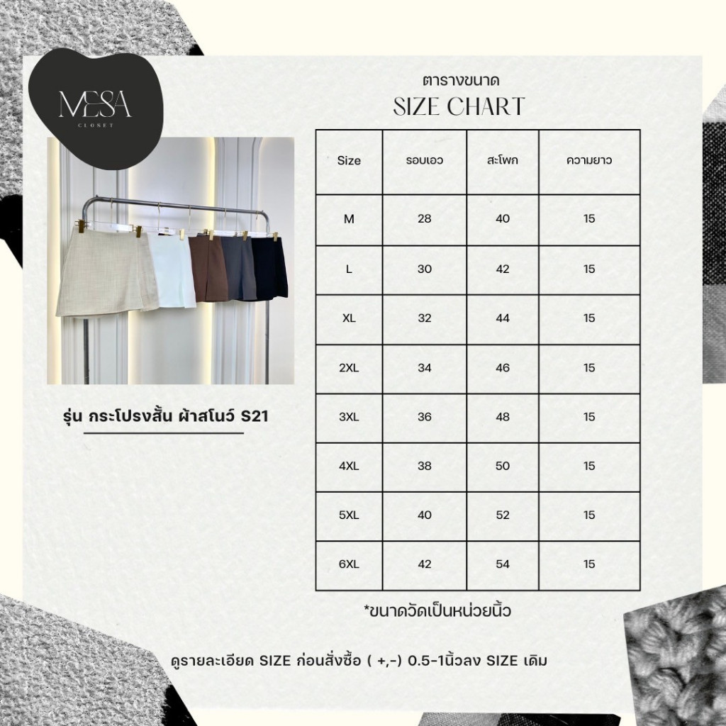 ... ารางไซส์ M : เอว28 สพ40 ยาว15 L : เอว30 สพ42 ยาว15 XL : เอว32 สพ44 ยาว 15 2XL : เอว34 สพ46 ยาว16 3XL : เอว36 สพ48 ยาว16 4XL : เอว38 สพ50 ยาว17 5XL : เอว40 สพ52 ยาว17 6XL : เอว42 สพ54 ยาว17 มีให้เลือกทั้งหมด5สี ขาว ครีม น้ำตาลเข้ม เทาเข้ม ดำ ขอบพระคุณที่อุดหนุนร้านmesa closet รบกวนให้คะแนน5ดาวเพื่อเป็นกำลังใจให้ทางร้านด้วยนะคะ