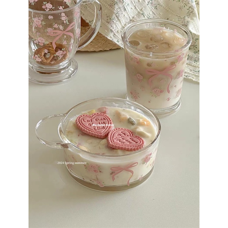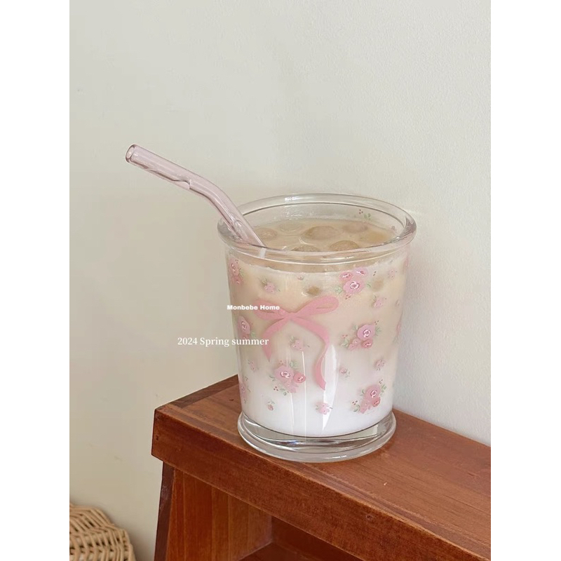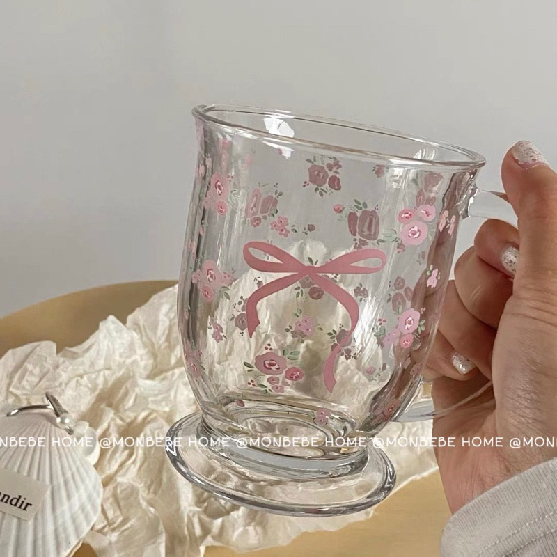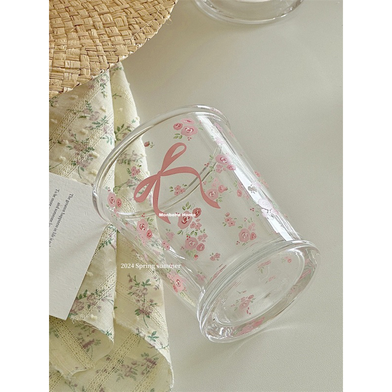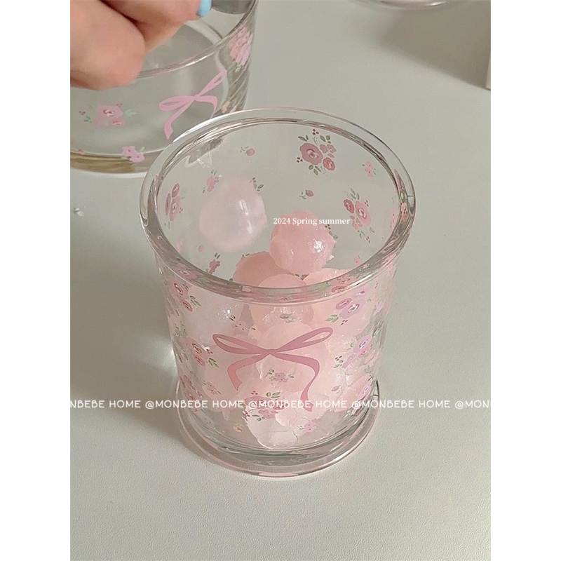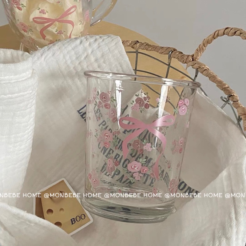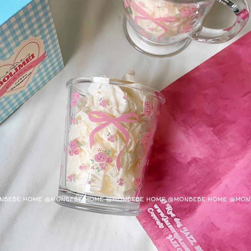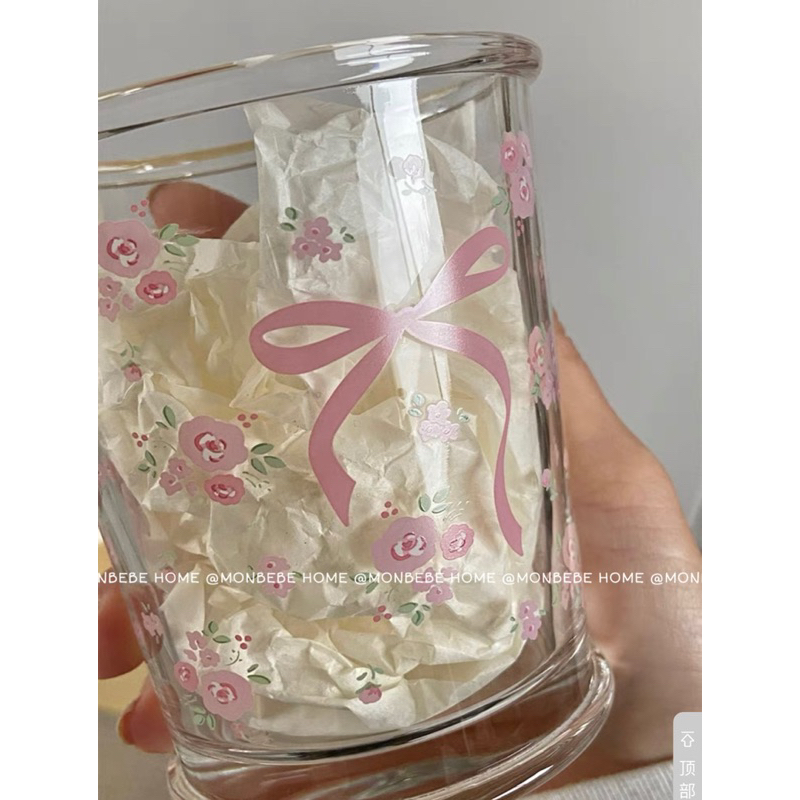พร้อมส่ง แก้วน้ำ แก้วกาแฟ 🎀🌸ลายโบว์ดอกไม้สีชมพู