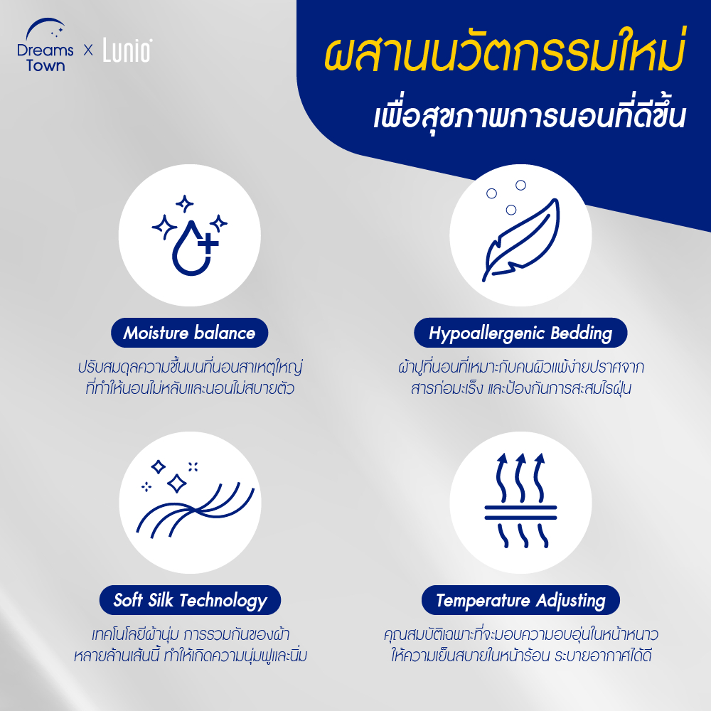 ... ิชย์, ธนาคารกรุงไทย, ธนาคารกสิกร, ธนาคารกรุงเทพ, ธนาคารกรุงศรีอยุธยา, กรุงศรีเฟิร์สช้อยส์, ธนาคารยูโอบี, ธนาคารซิตี้แบงก์) 🚚 จัดส่งฟรี ทั่วประเทศ โดยเลือกช่องทางการจัดส่งแบบ “Seller Own Fleet" 📌 ลูกค้าสามารถเก็บเงินปลายทางได้ โดยเลือกช่องทางการจัดส่งแบบ “Standard Delivery ” 👍 จัดส่งในรูปแบบเซ็ตผ้าปูที่นอนในกล่อง ติดตั้งสะดวก ----------------------------------------------------------------------------------------- ✨Lunio Microsilk Bedding Set เซ็ตผ้าปูที่นอน เทคโนโลยีชะลอวัย ใช้เส้นใยmicroซึ่งมีขนาดที่เล็กมาก เวลาสัมผัสไม่ทำให้หน้าเกิดริ้วรอย ทำจากผ้าไมโครซิลค์สัมผัสนุ่ม ถักทอด้วยเส้นใย 990 เส้นด้าย เพิ่มกระบวนการเย็บเเบบเเน่นหนากันผ้ารุ่ยทุกจุดพับผ้าหลายชั้นเเละทุกชั้นก็เย็บหลายเทคนิคทั้งเย็บกันรุ่ย เเละเย็บเพื่อความยืดหยุ่น ทำให้ได้เซ็ตผ้าปูที่ดีที่สุด ใช้งานได้ยาวนาน ✨ คุณสมบัติของเซ็ตผ้าปูที่นอน Lunio Microsilk✨ 💯 ผ้าปูมียางยืด 360° ปูสะดวก ตึงเรียบ ไม่หลุดง่าย การเย็บเเน่นหนากันผ้ารุ่ยทุกจุด ใช้ได้กับที่นอนหนาสูงสุด 15 นิ้ว 💯 ปลอกหมอนหนุนพรีเมียมดีไซน์หรูหรา หนานุ่ม ริ้วกว้างถึง 6 cm ทั้ง 3 ด้าน ด้านในปลอกหมอนกันหมอนหลุดได้ดี เพราะยาวถึง 13 นิ้ว 💯 ปลอกหมอนข้างกลีบดอกไม้ดีไซน์สวย ทันสมัย เย็บหลายเทคนิคทั้งเย็บกันรุ่ย เเละเย็บเพื่อความยืดหยุ่น ปลายปลอกหมอนทั้งสองข้าง จะเป็นกรีบโบว์ดอกไม้ ✨ ผสานนวัตกรรมใหม่เพิ่มความสุขบนที่นอน✨ 💡 Anti Aging Microsilk 990 TC เส้นใยผ้าถนอมผิวหน้าเเละผิวกาย ถักทอ 990 เส้นด้าย ทำให้เกิดช่องว่างระหว่างผ้าน้อยมากเเละส่งผลให้เกิดการการพองตัวเพื่อรองรับน้ำหนักเเละโอบอุ้มผิวเราทำให้ไม่เกิดริ้วรอยหรือ ไม่เกิดการกดทับบนใบหน้า จึงสามารถถนอมผิวเเละลดการเกิดริ้วรอยบนผิวหน้าเเละผิวกายได้นั่นเอง 💡 Moisture balance ปรับสมดุลความชื้นบนที่นอน สาเหตุใหญ่ที่ทำให้นอนไม่หลับเเละนอนไม่สบายตัว โดยเส้นใย Microsilk นี้จะจับกับความชื้นส่วนเกินบนผิวกายเราอย่างรวดเร็ว เเละปล่อยให้ระเหยออกจากพื้นผิวผ้าไปกับอากาศรอบข้างทำให้สะบายผิว พอดีกับการนอน 💡 Hypoallergenic Bedding ผ้าปูที่นอนที่เหมาะกับคนผิวเเพ้ง่าย ปราศจากสารก่อมะเร็ง และป้องกันการสะสมไรฝุ่น เนื่องจากเส้นใยเล็กระดับไมโคร จึงไม่เป็นที่อยู่สำหรับไรฝุ่น เพราะไม่เป็นสภาพเเวดล้อมที่ไรผุ่นอยู่ได้ 💡 Soft Silk Technology เทคโนโลยีผ้านุ่ม การรวมกันของผ้าหลายล้านเส้นนี้ทำให้เกิดความนุ่มฟูเเละนิ่ม คิดค้นโดย Lunio โดยการทำให้เส้นใยผ้าเล็กที่สุดเเละนำมาผสานรวมกันหลายล้านเส้นจนเป็นผ้า 1 ผืน 💡 Temperature Adjusting คุณสมบัติเฉพาะที่จะมอบความอบอุ่นในหน้าหนาวให้ความเย็นสบายในหน้าร้อน ระบายอากาศ