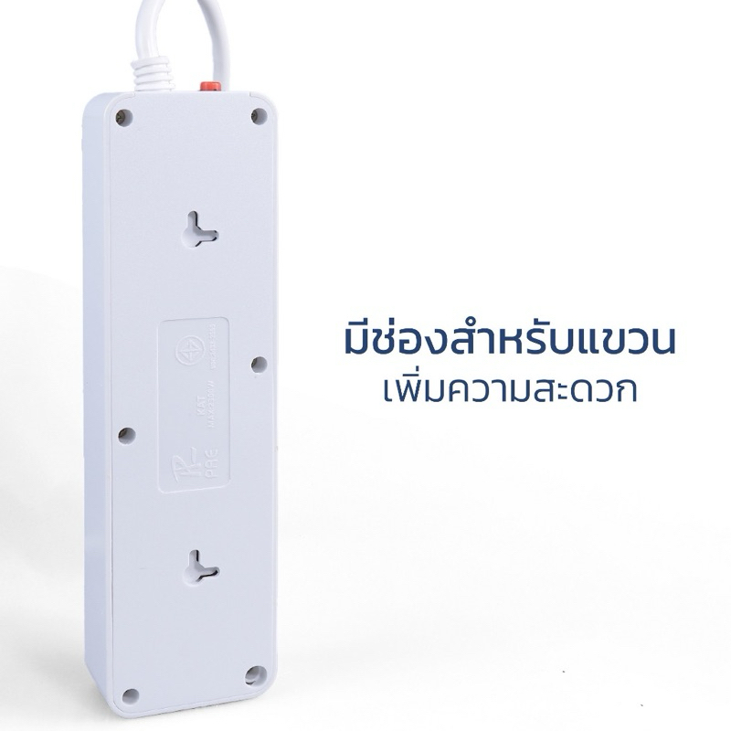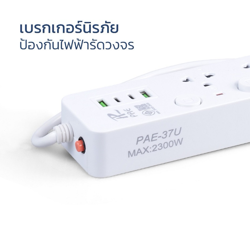 คุณสมบัติ - สายไฟยาว 3/5/10 เมตร - มีช่อง USB 2ช่อง - มีช่อง Type-C 1ช่อง - ปลั๊กพ่วง 3ตา พร้อมสวิตช์ปิด-เปิด - กำลังไฟ 10 แอมป์ 250 โวลท์ Max Load สูงสุด 2300 วัตต์ - ระบบป้องกันความร้อนเกิน 130 องศาเซลเซียล - มาตรฐาน คุณภาพสูง มอก. 2432-2555 - ข้อควรระวัง - ควรปิดสวิตซ์เครื่องใช้ไฟฟ้าก่